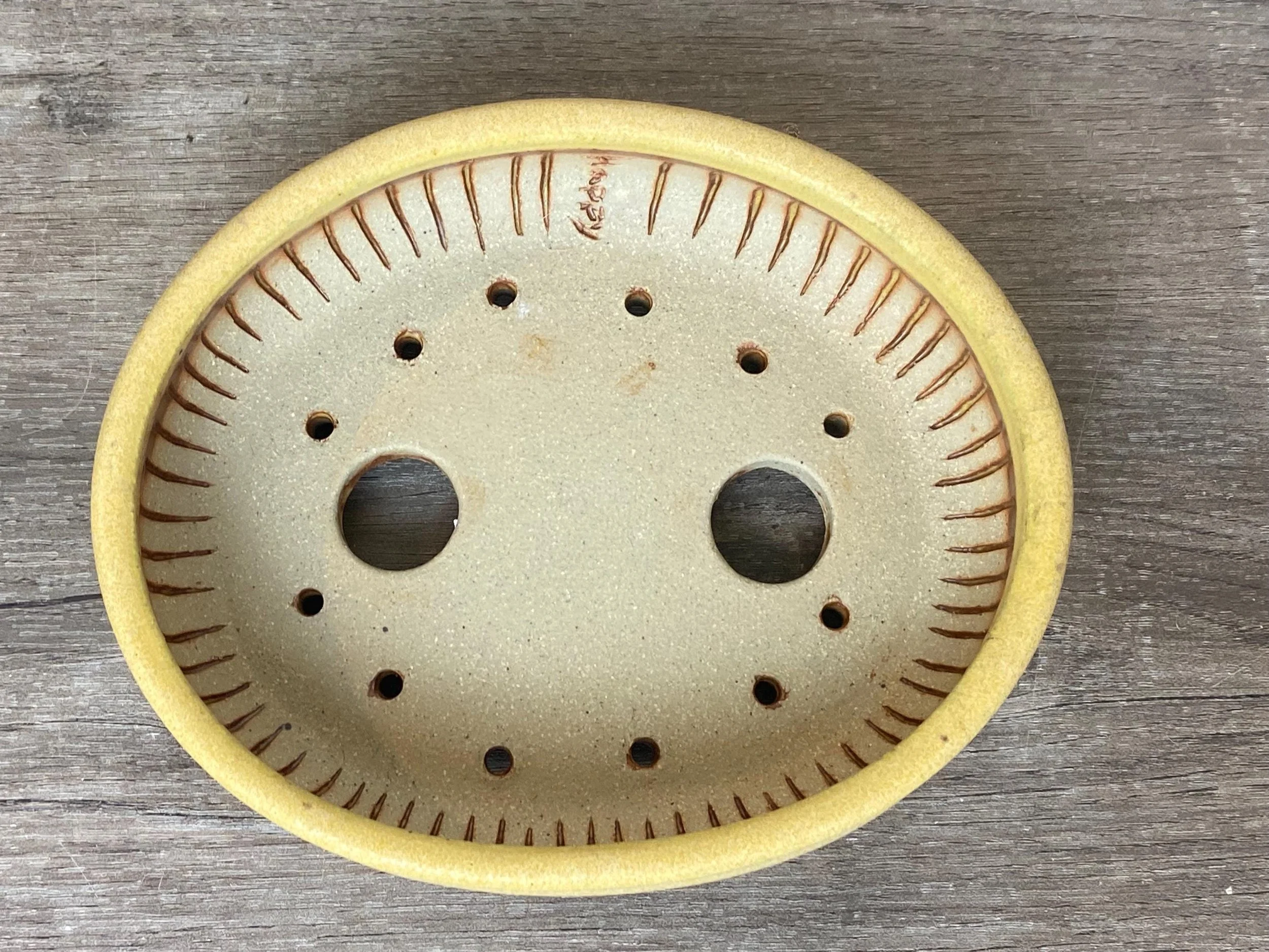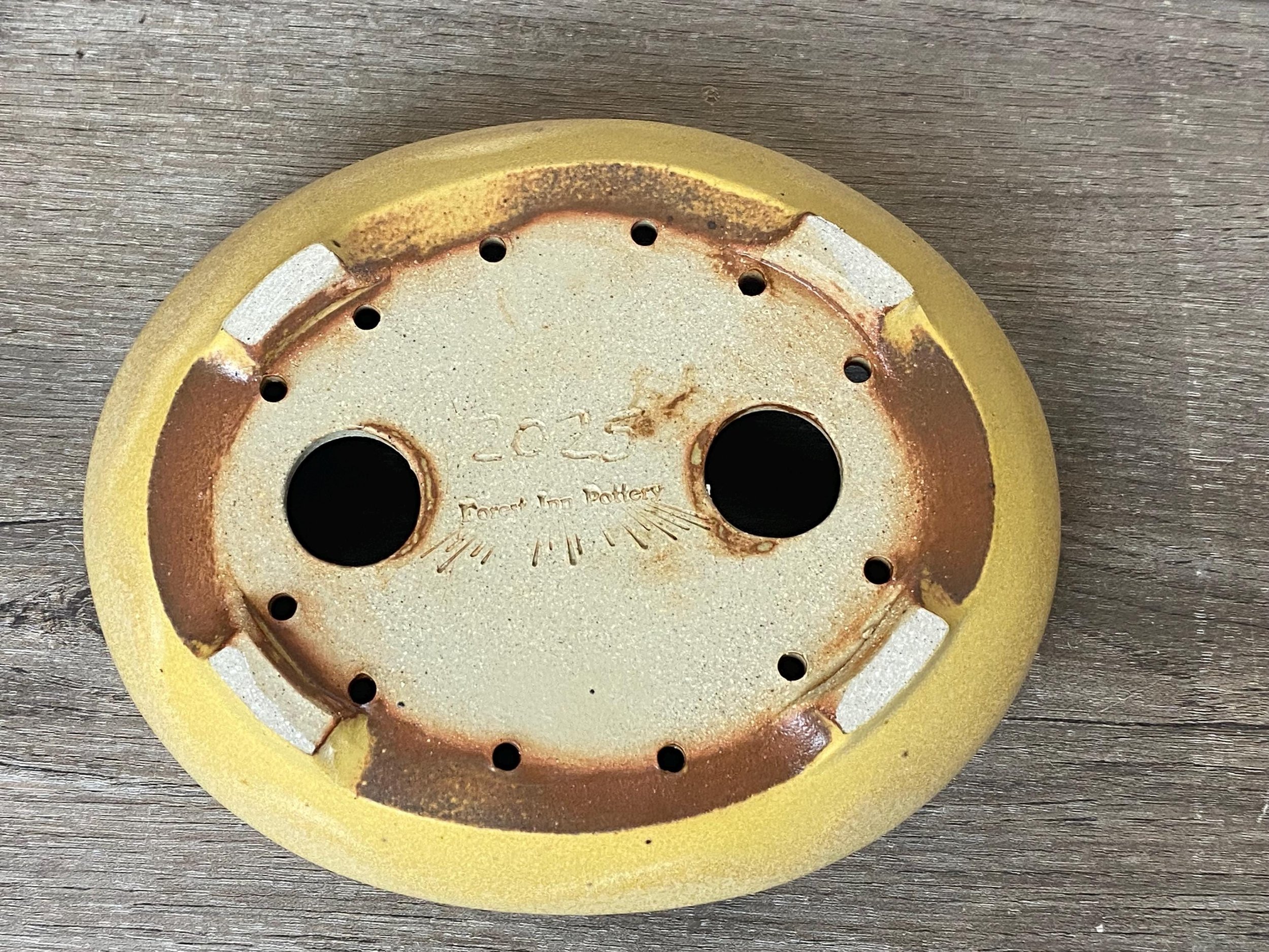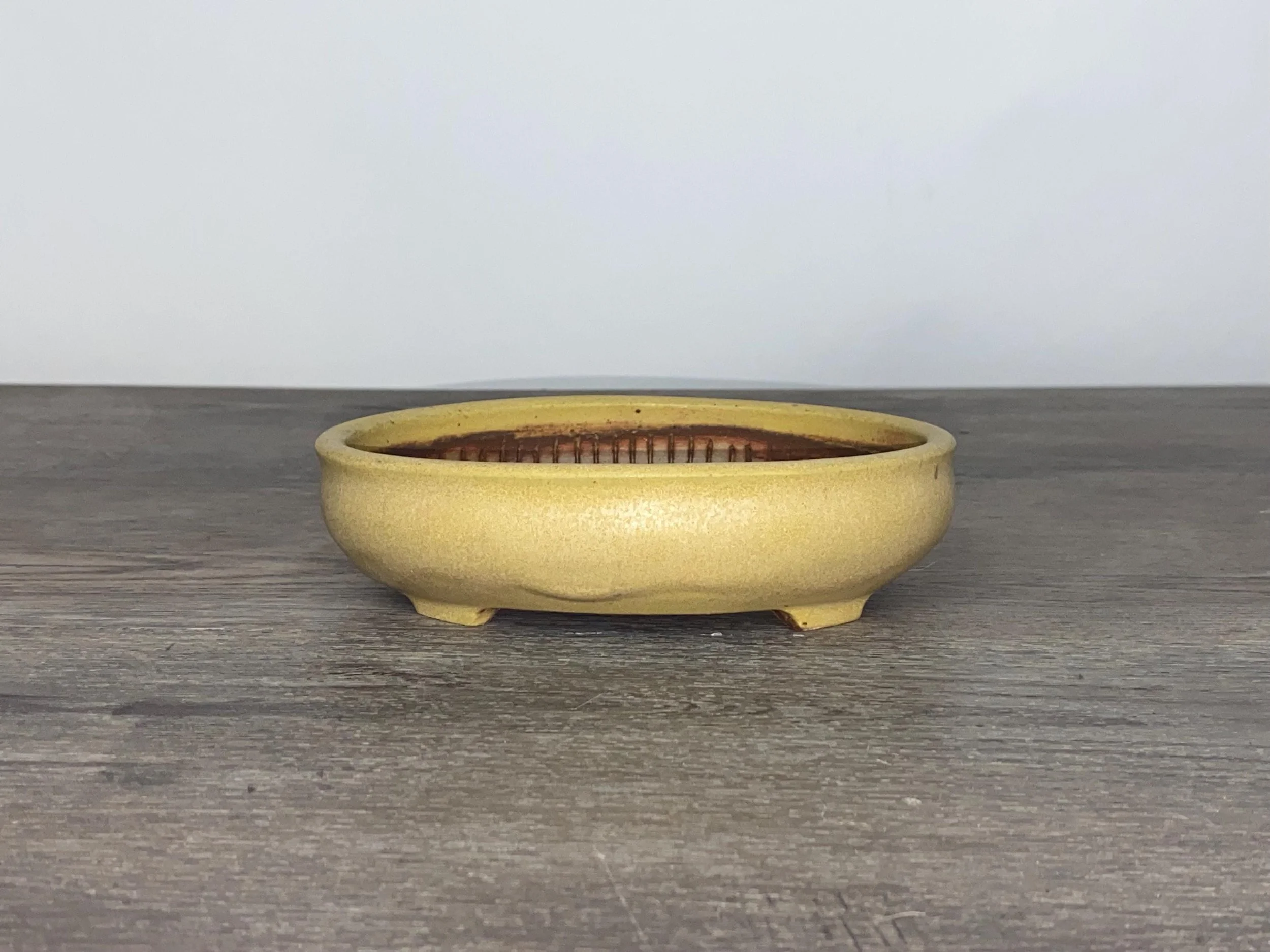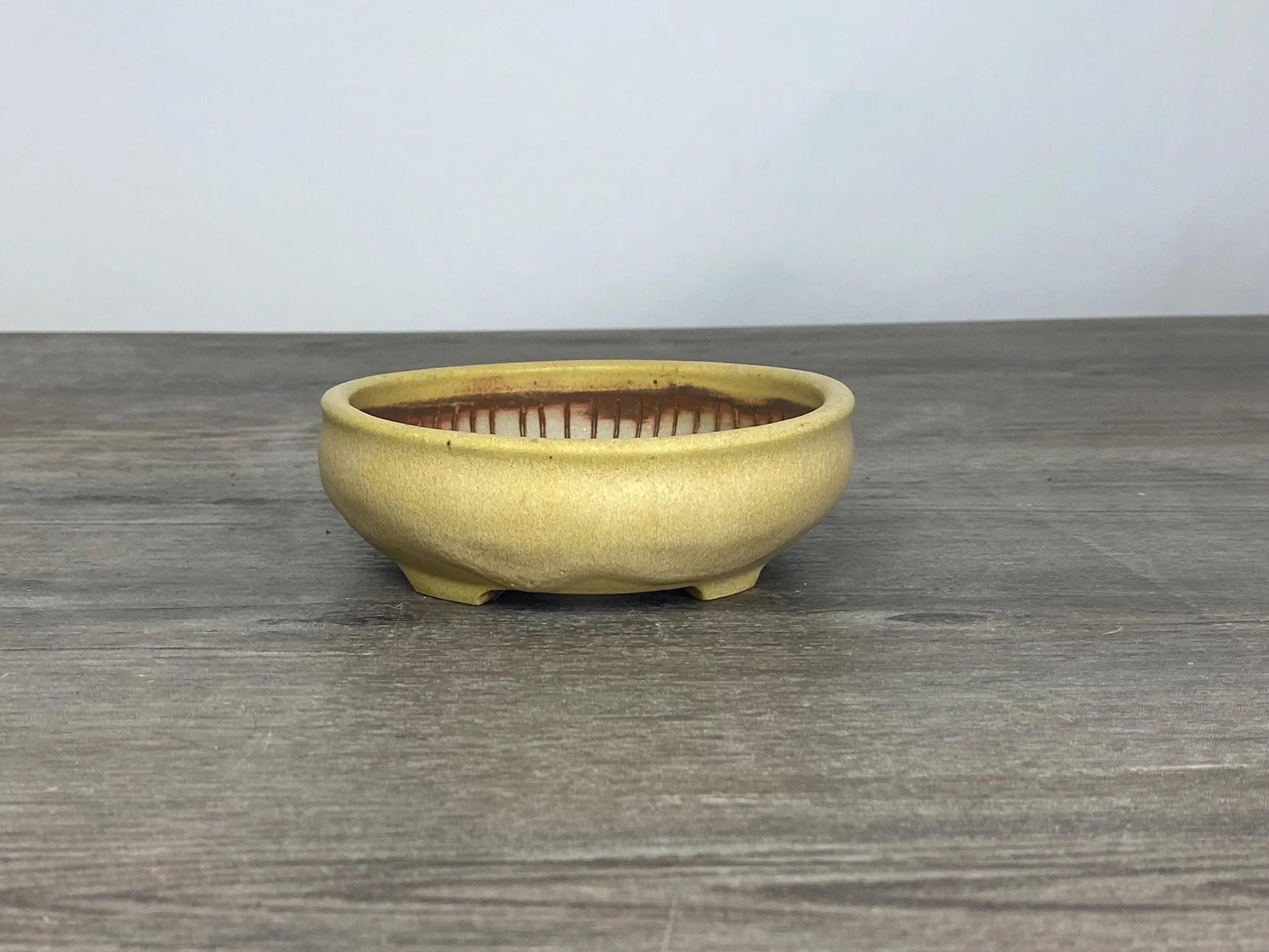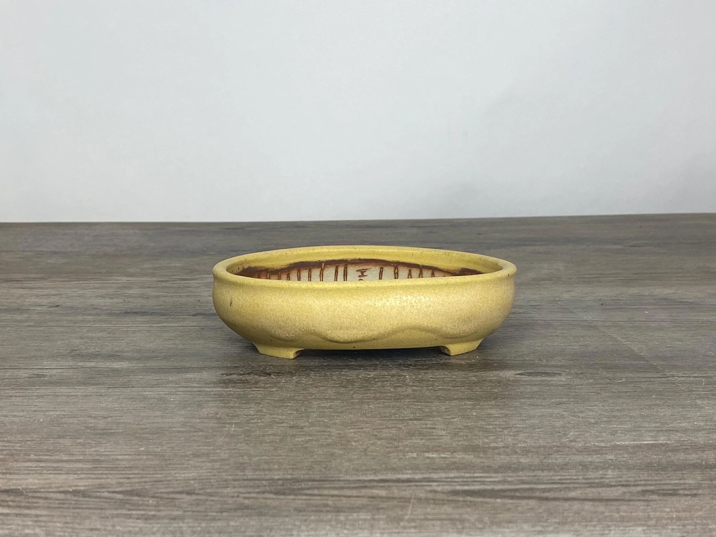 Nice little yellow bonsai pot. Would look really nice with something that gets red fall leaves. Lines are carved on the inside walls to help prevent roots from circling the inside of the pot. A message inside is written to the tree that says, "Happy".