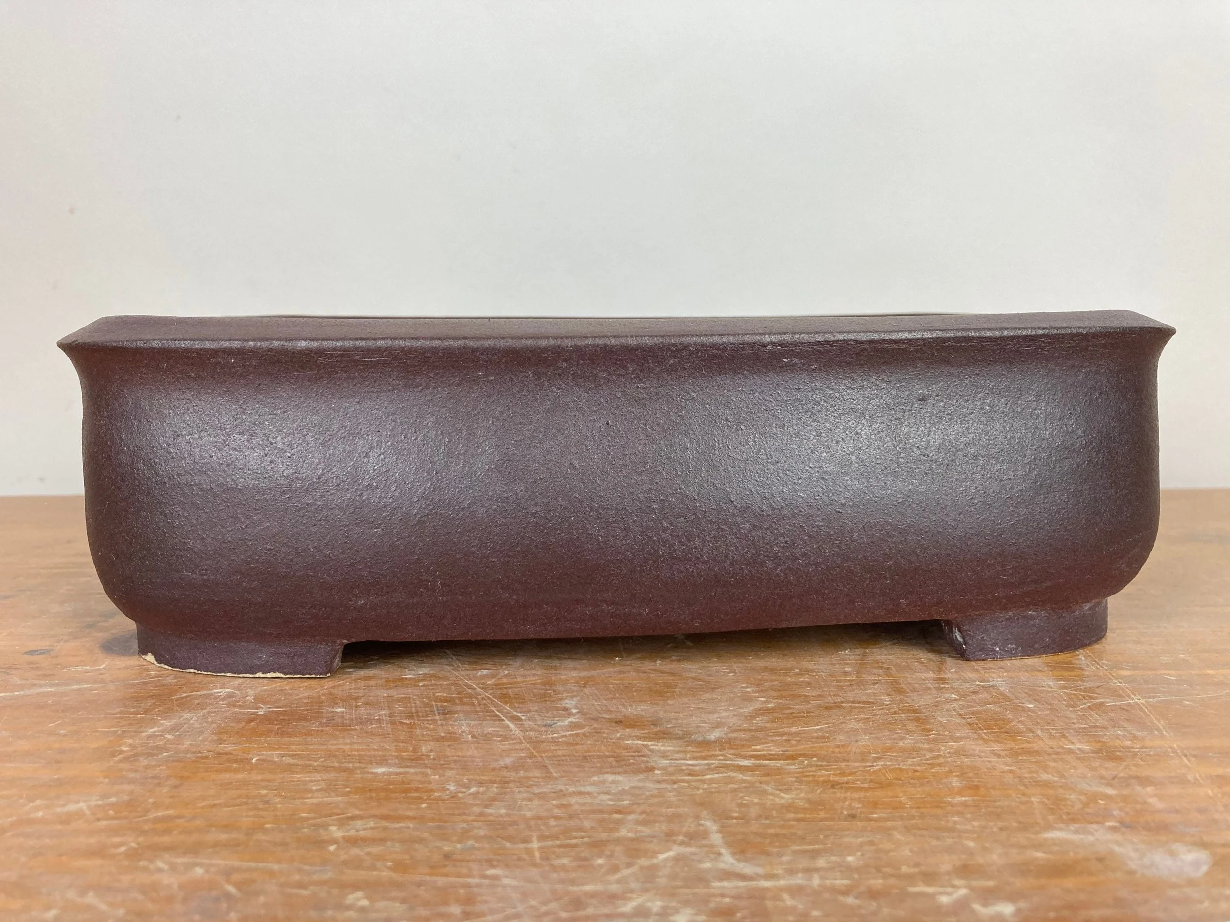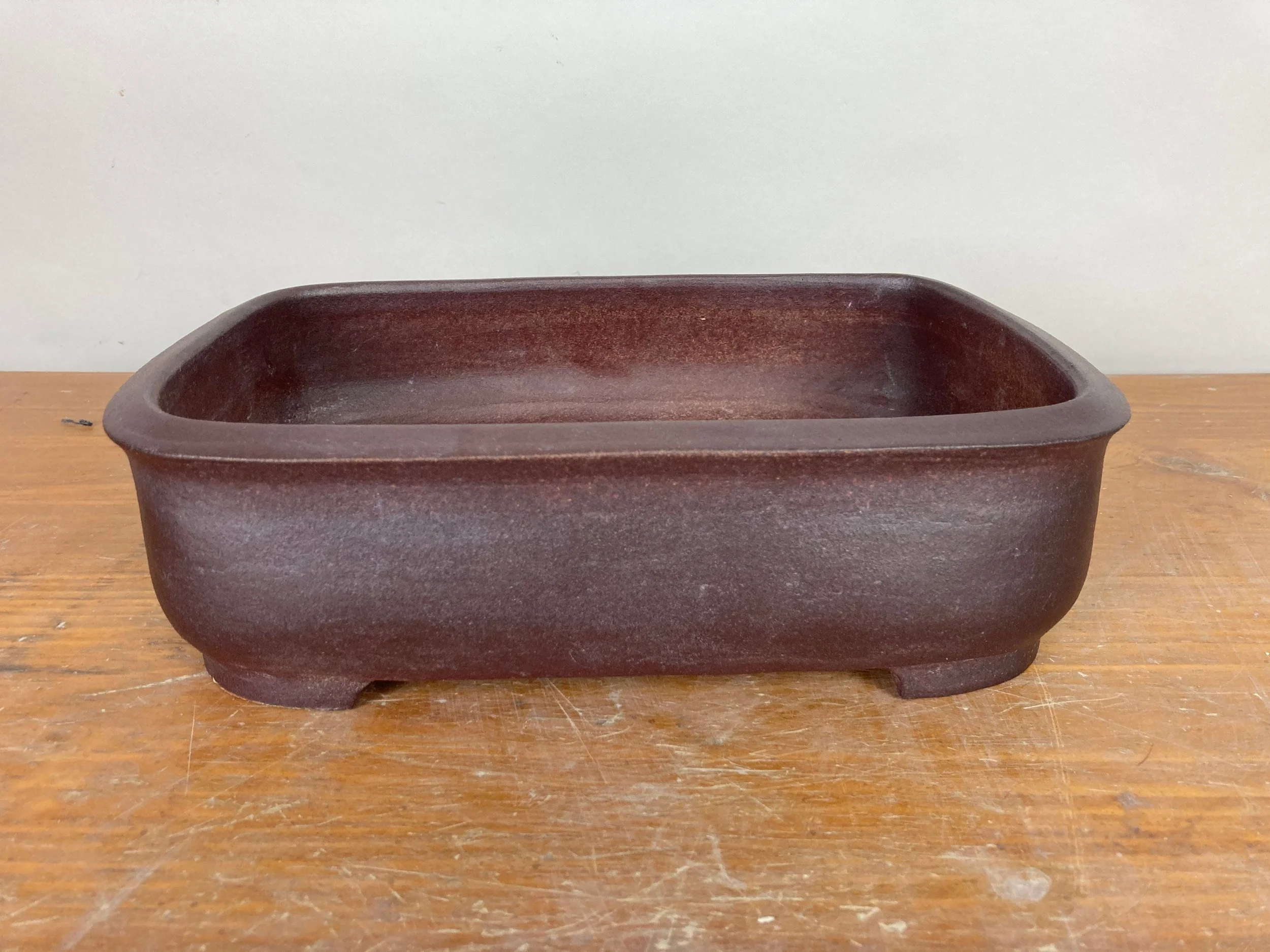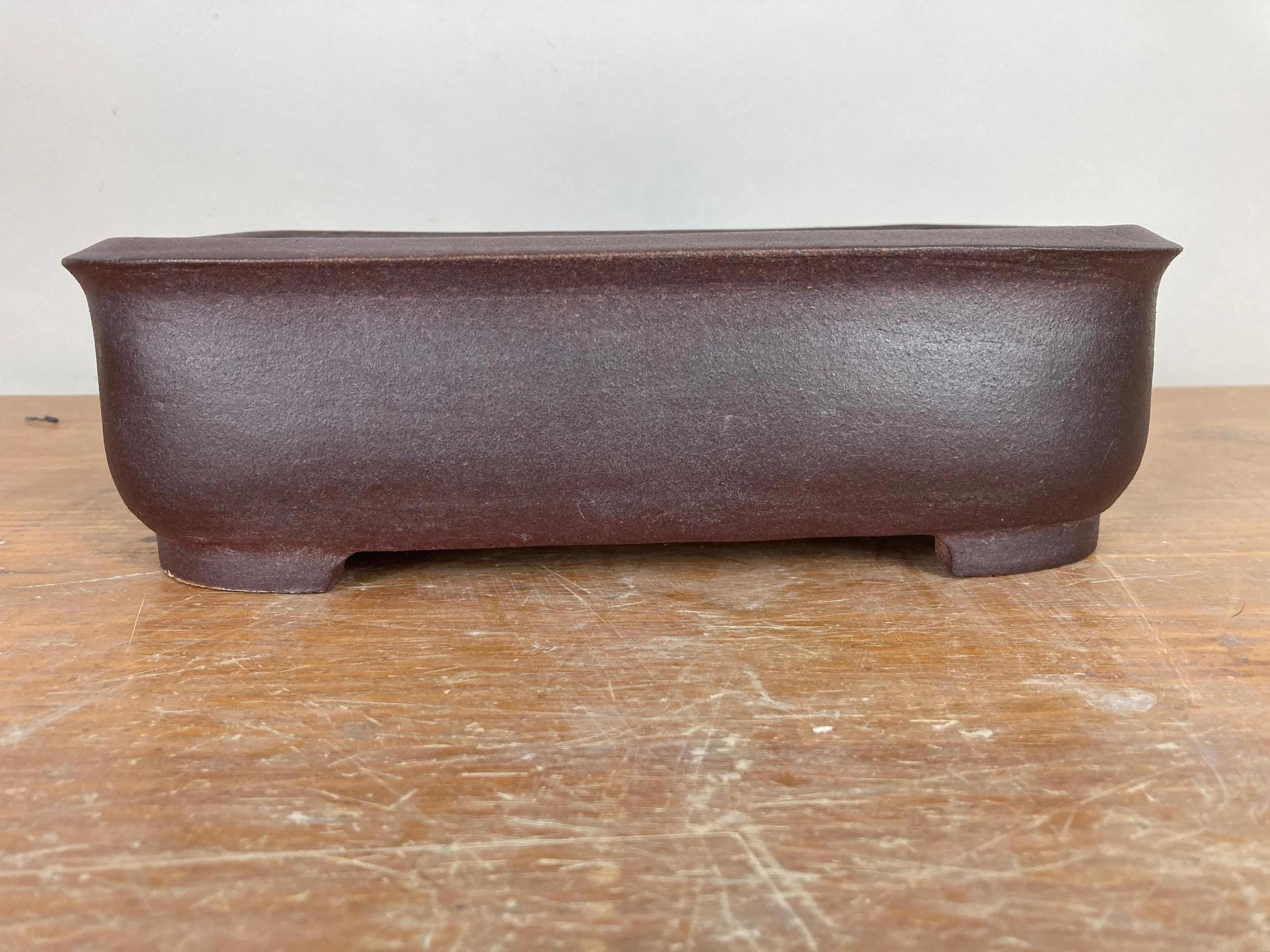 A nice burgundy stain was used on this smooth rectangle pot. It is 10.5” long, 7” wide and 3” tall and was high fired to be frost resistant and durable for outdoor use.