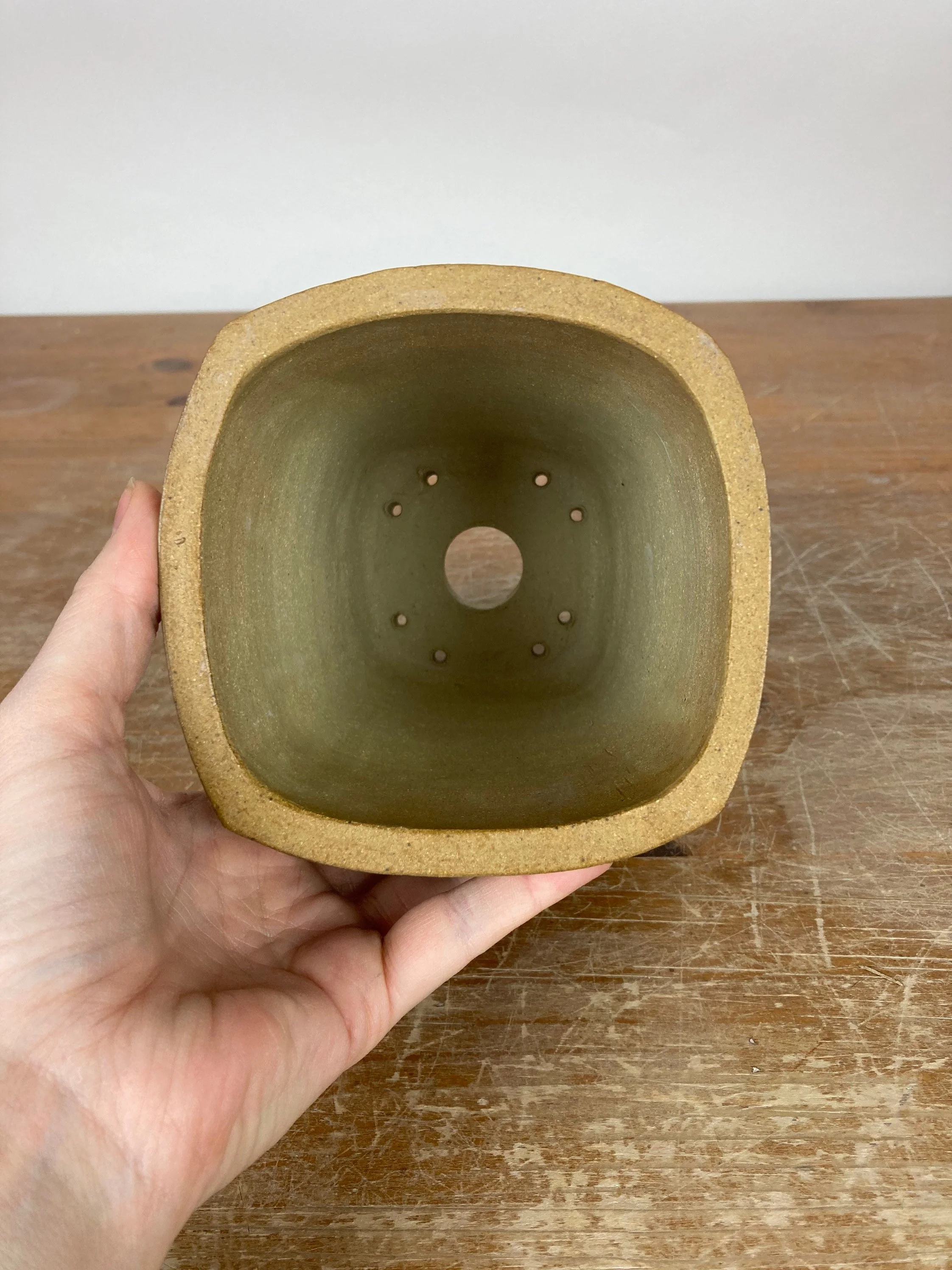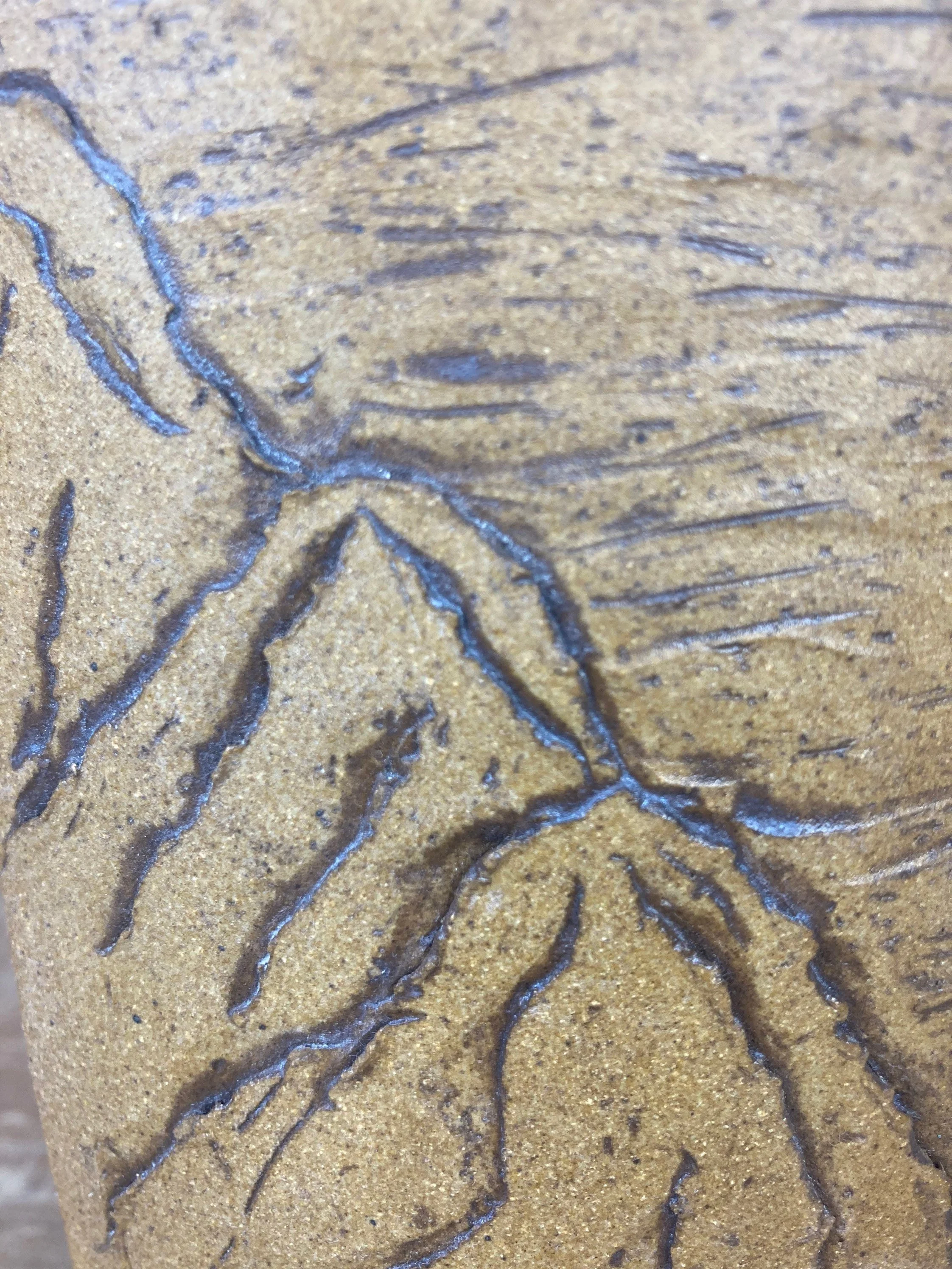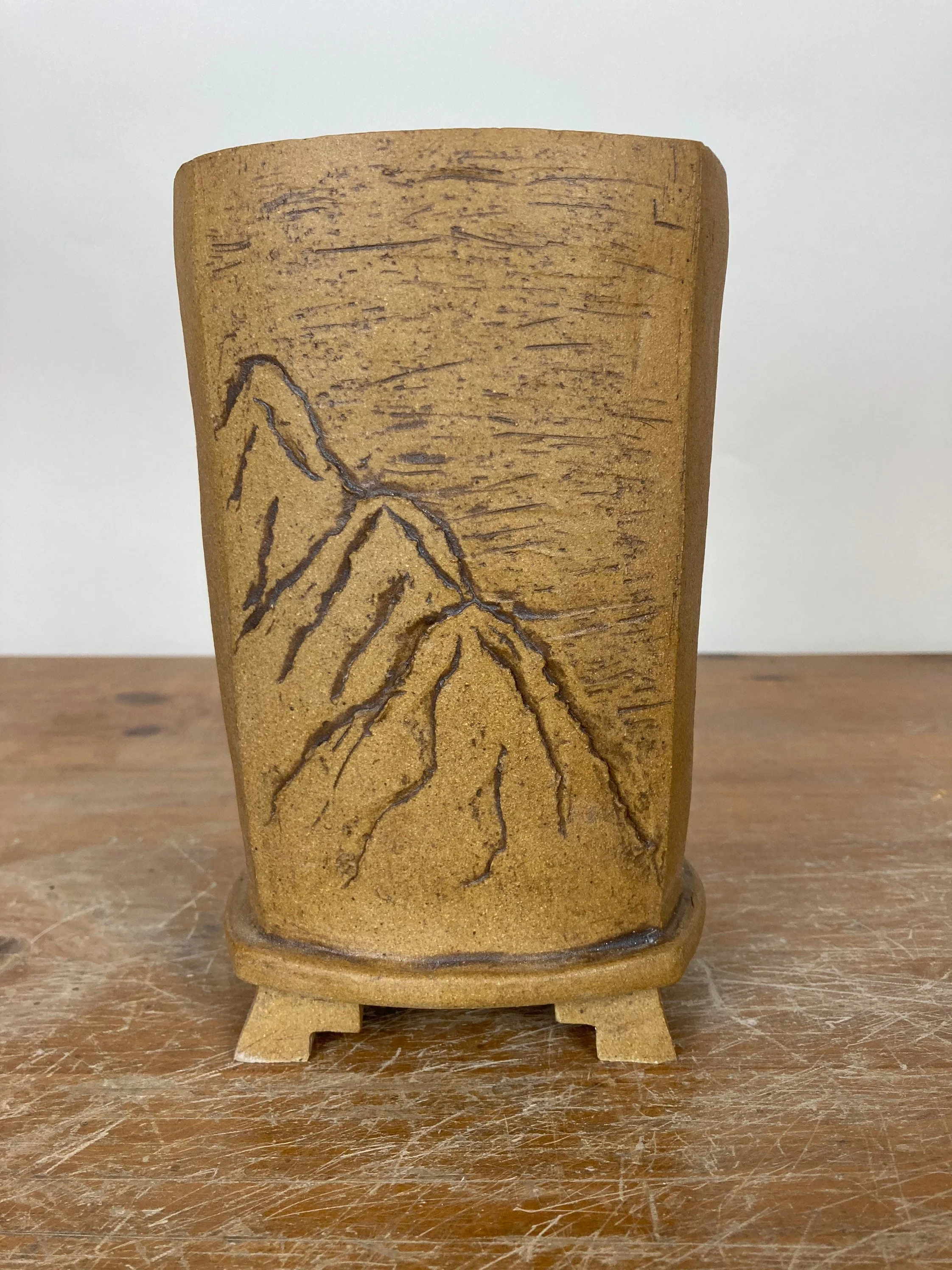 Tall cascade bonsai pot with mountains carved on two opposite sides. One side has the mountains going up and to the left, the other has them going up and to the right. That way, you can choose the side depending on what side your tree cascades to. This pot was high fired to be frost resistant and durable. The exterior dimensions are 4.75 inches wide and 7.5 inches tall. The planting area inside is 4 inches wide and 6.5 inches deep.