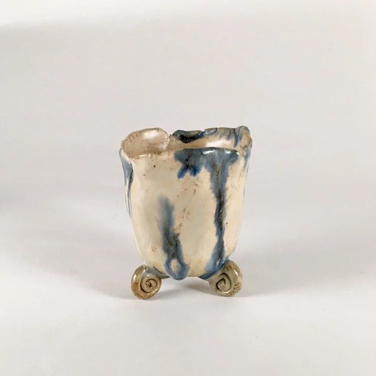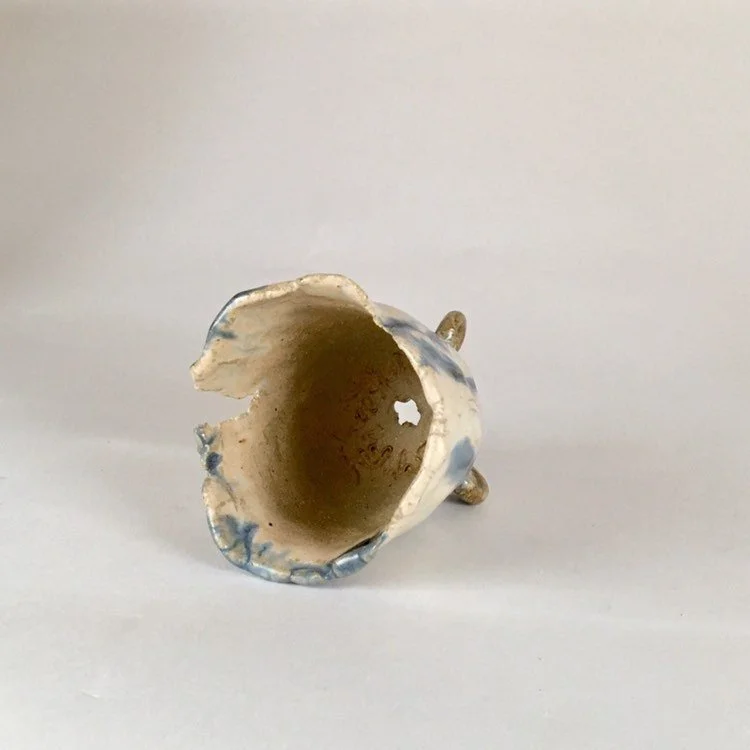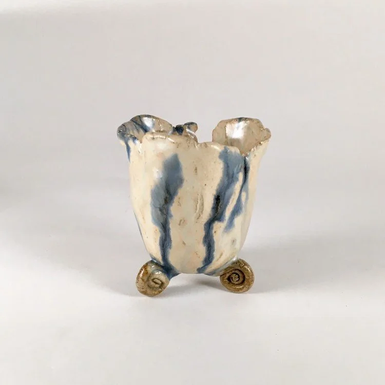 Small flower shaped planter with curly feet. Can be used for a small bonsai, kusamono or shitakusa or whatever you would like to plant in it. It was made free form to allow imperfections to define it and glazed with two glazes to bring out the interesting shape. This little pot was high fired making it frost resistant and durable. It is approximately 2.5 inches in diameter and 3 inches tall.