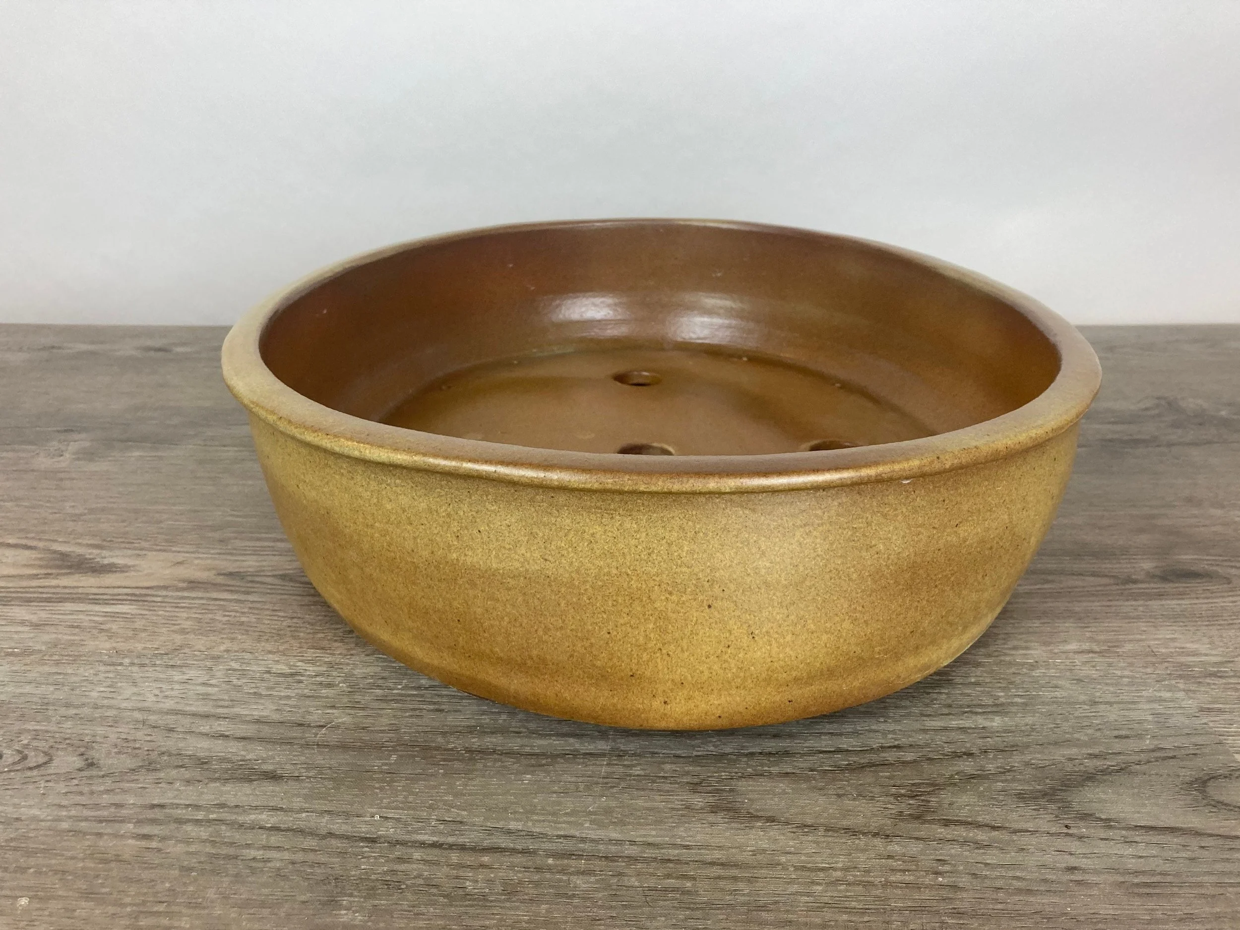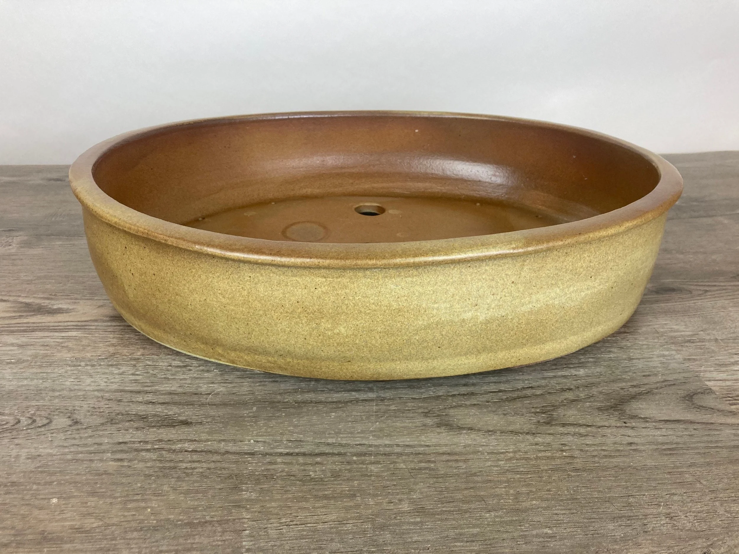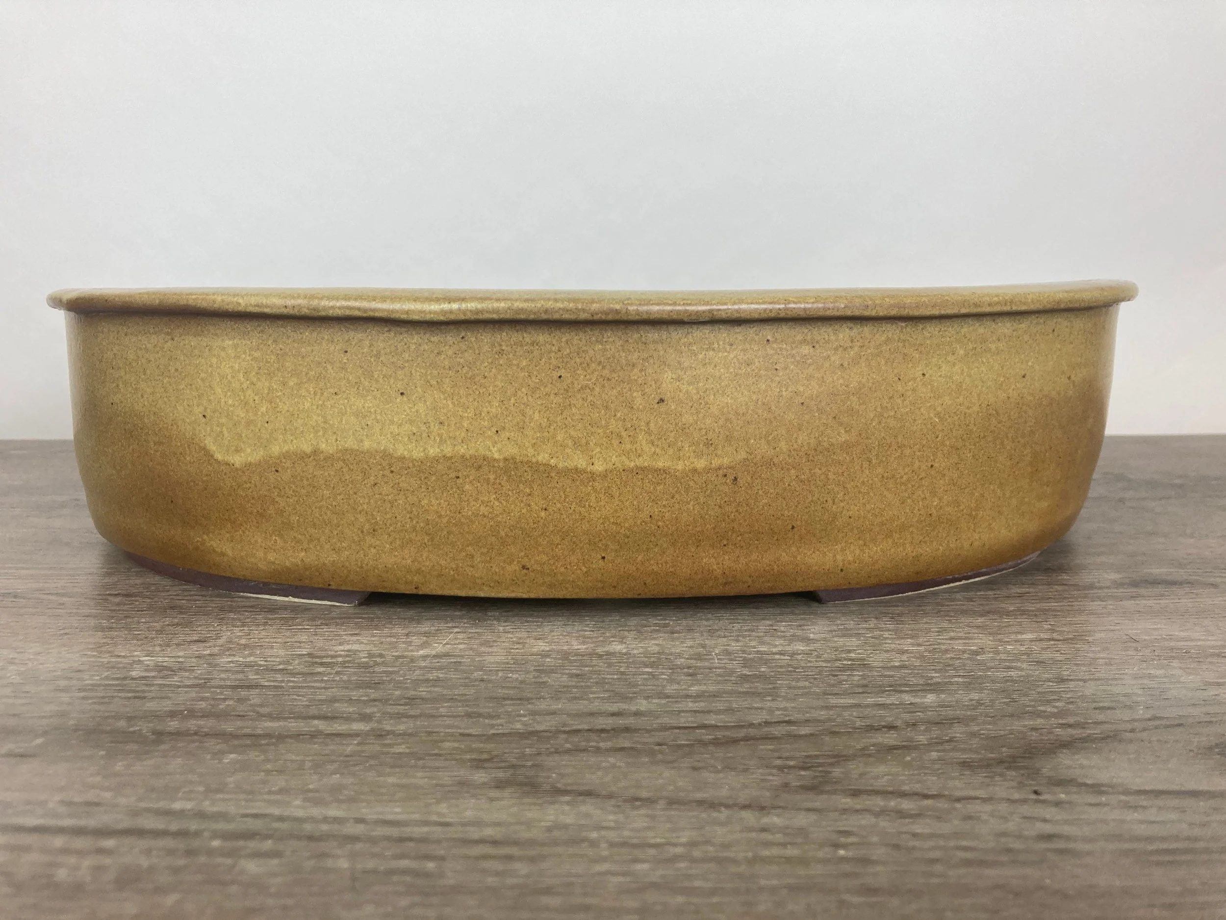 This yellowish brown glaze on a rimmed pot is 16.25" long, 14" wide and 3.75" tall overall and the inside planting area is 15" long, 12.75" wide, and 3" deep. It was high fired to be frost resistant and durable for outdoor use.