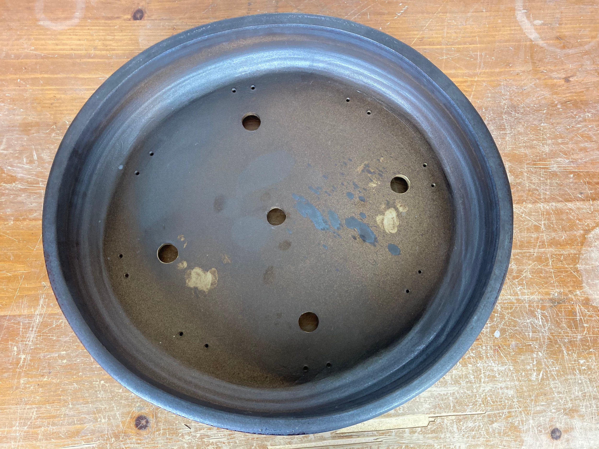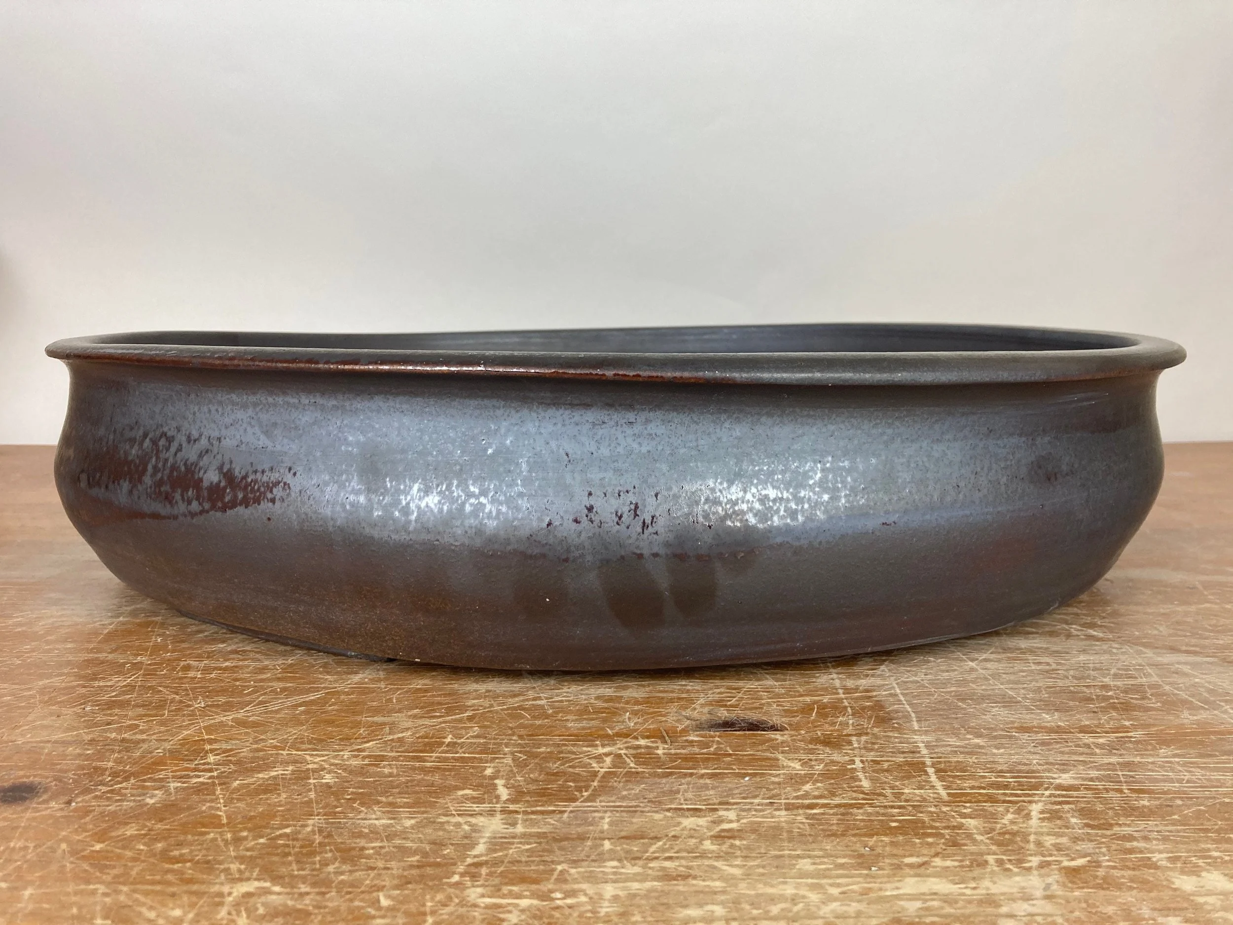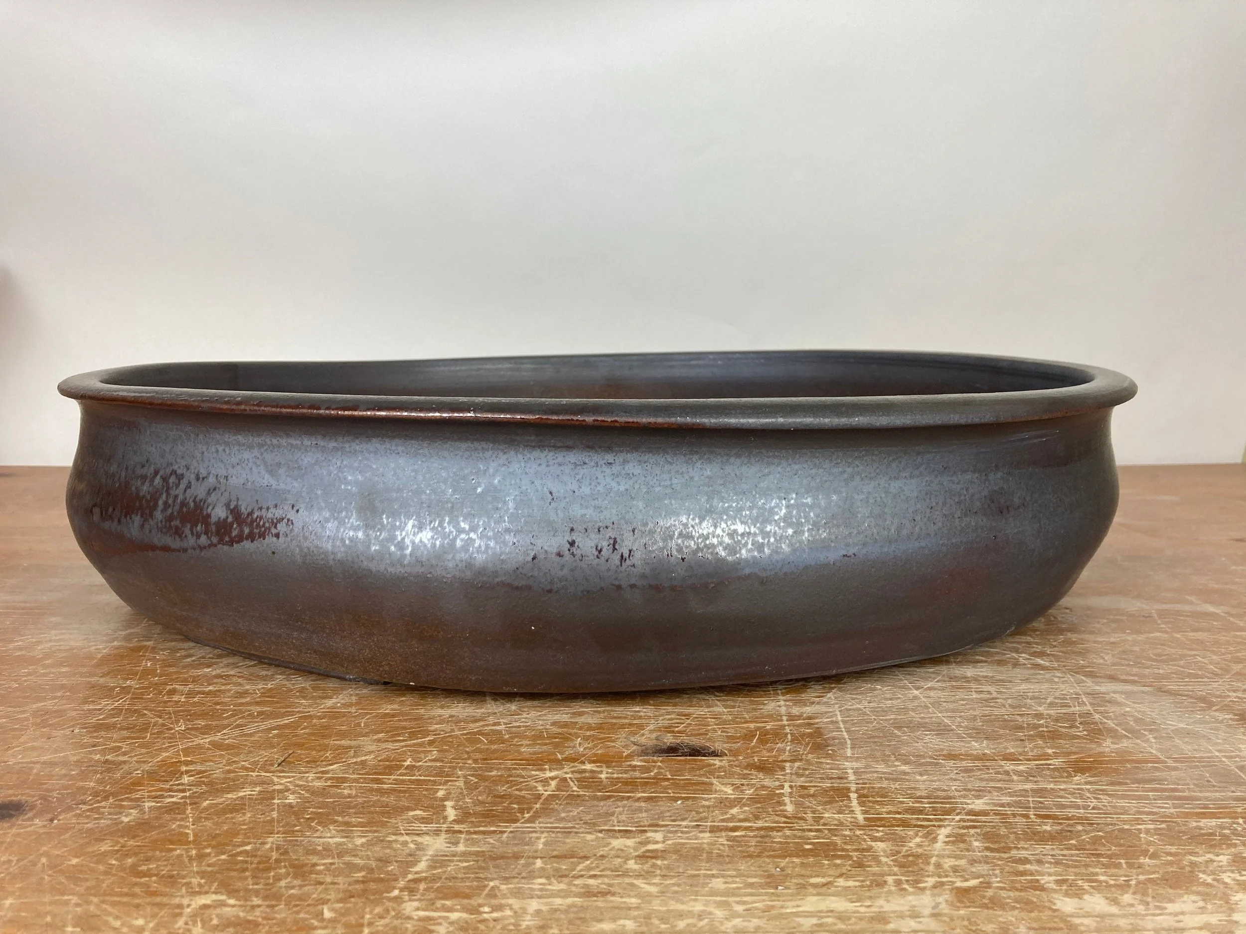 This big oval pot was stained dark brown with a semi-matte finish. Pot is 20.25 inches long, 18.5 inches wide and 4 inches tall on the outside. The planting area is 19 inches long 17 inches wide and 3.5 inches deep. The pot has five drainage holes along with plenty of tie down holes and was high fired to be frost resistant and durable for outdoor use.