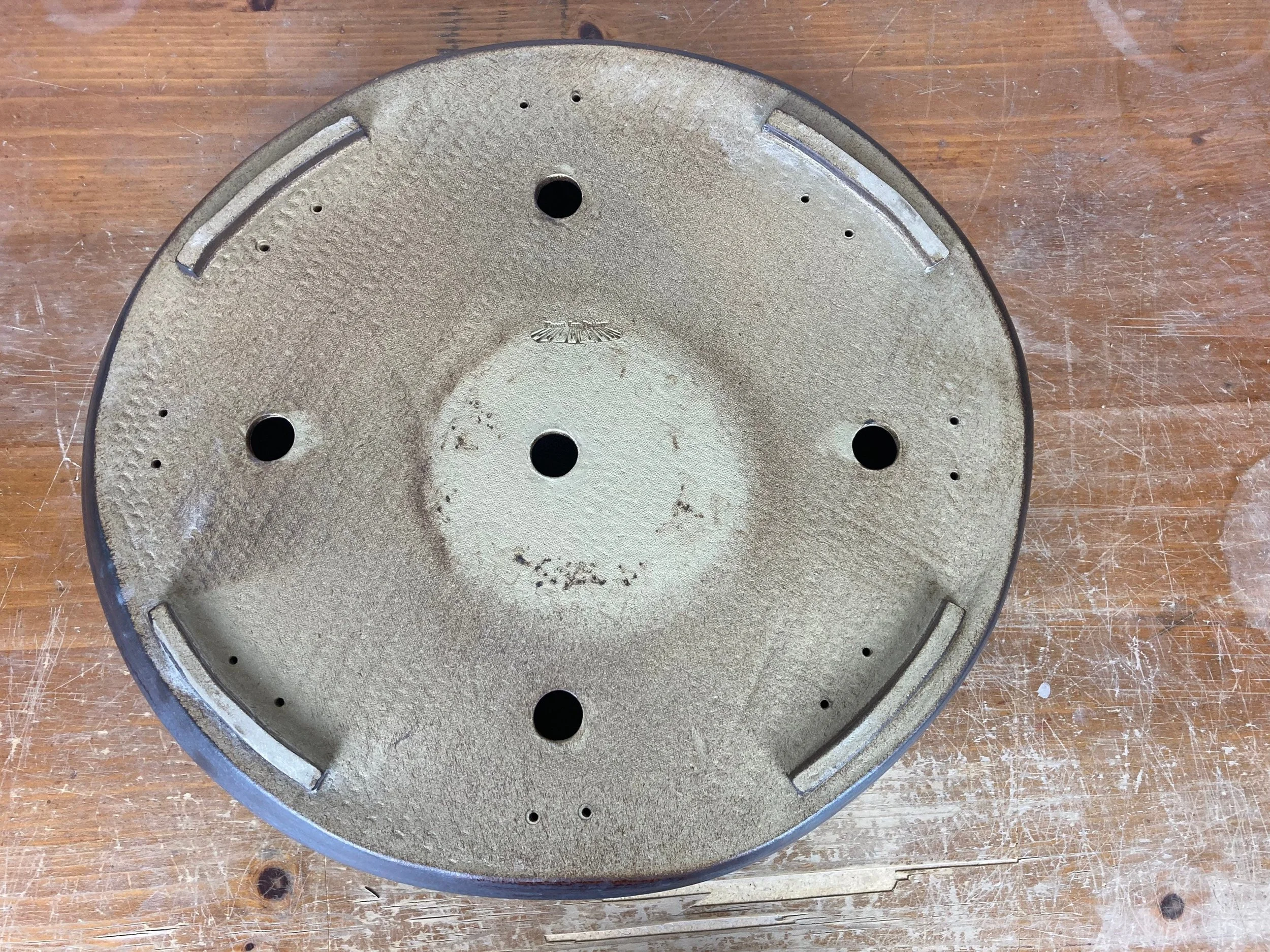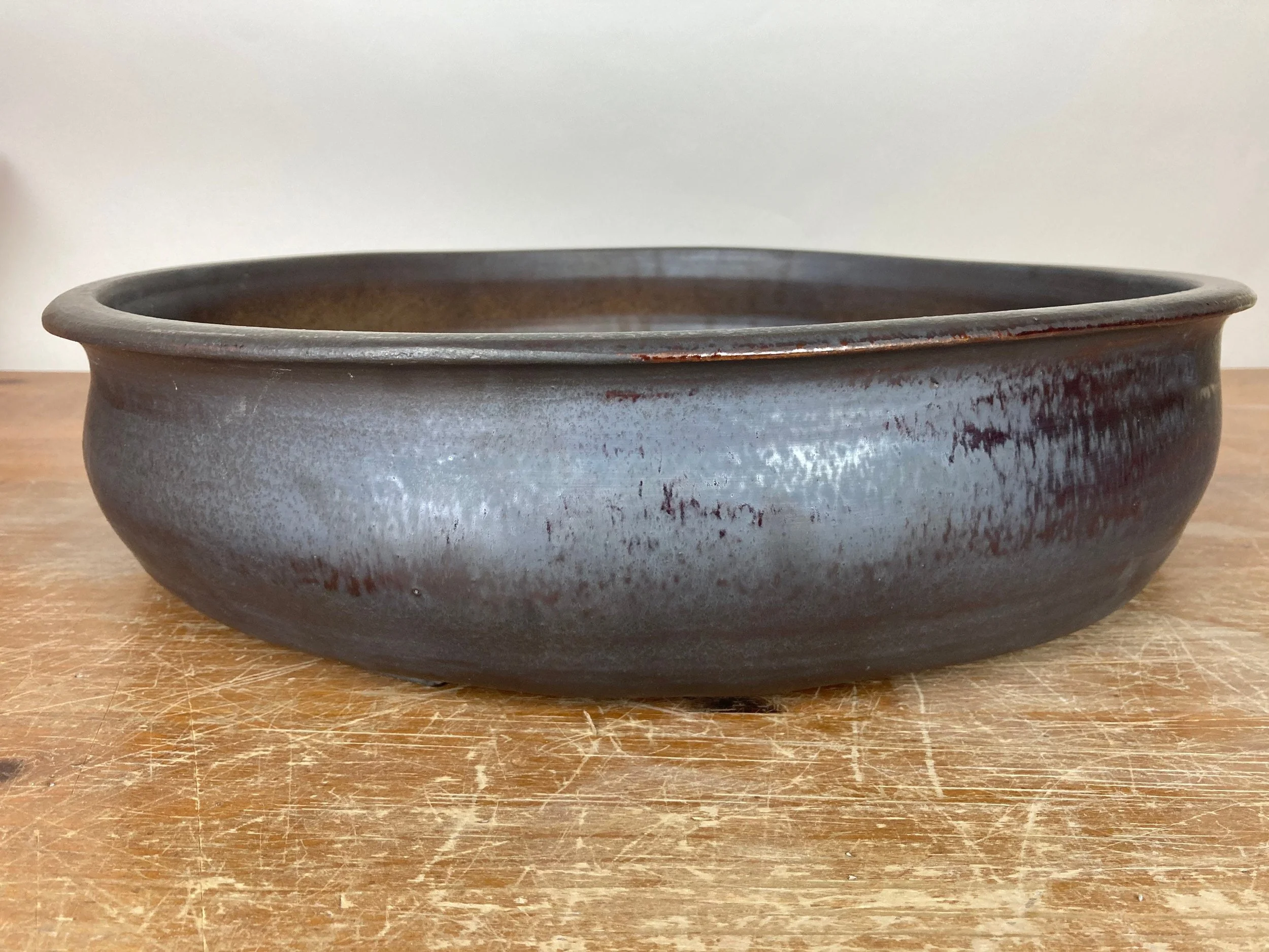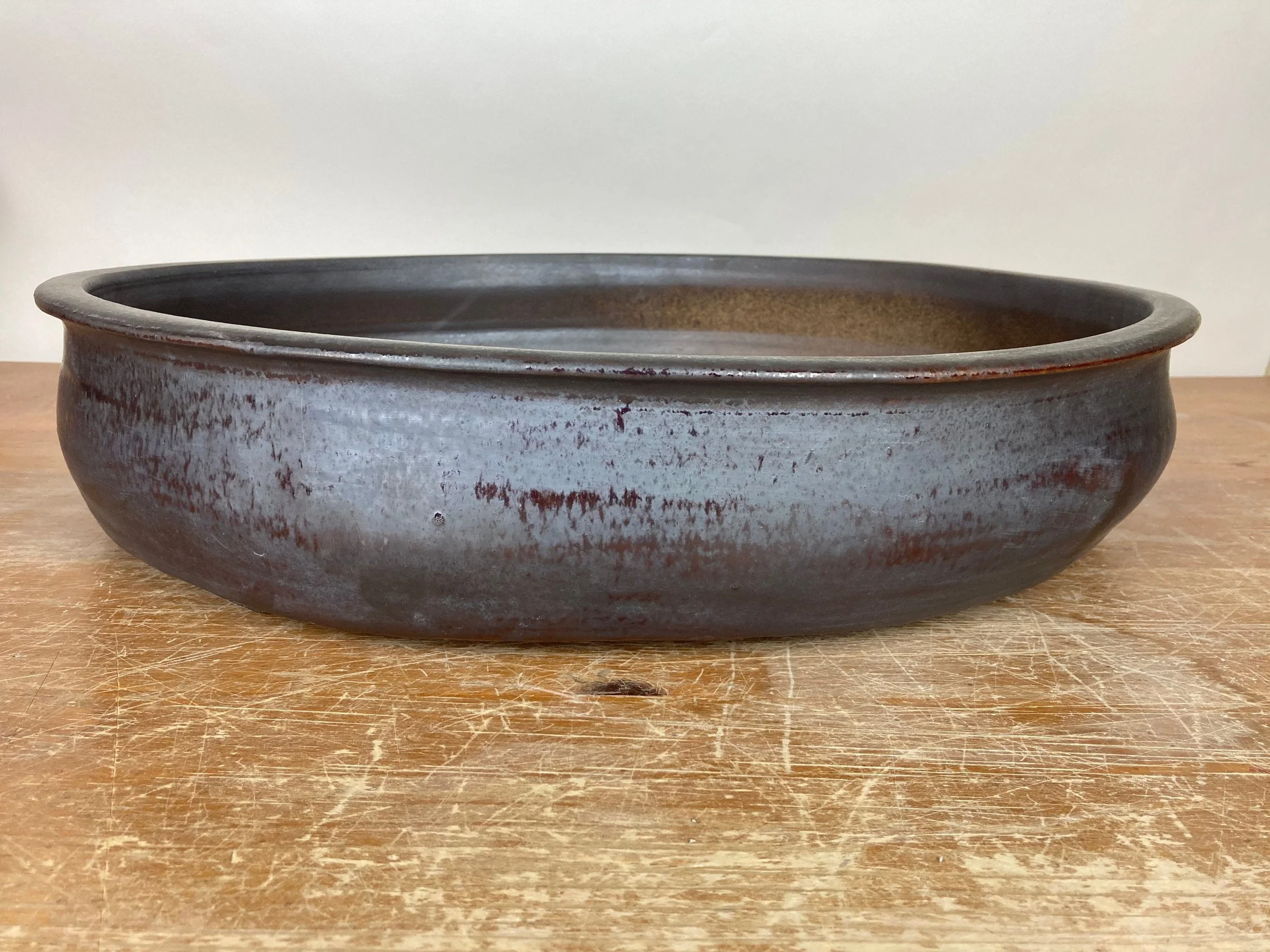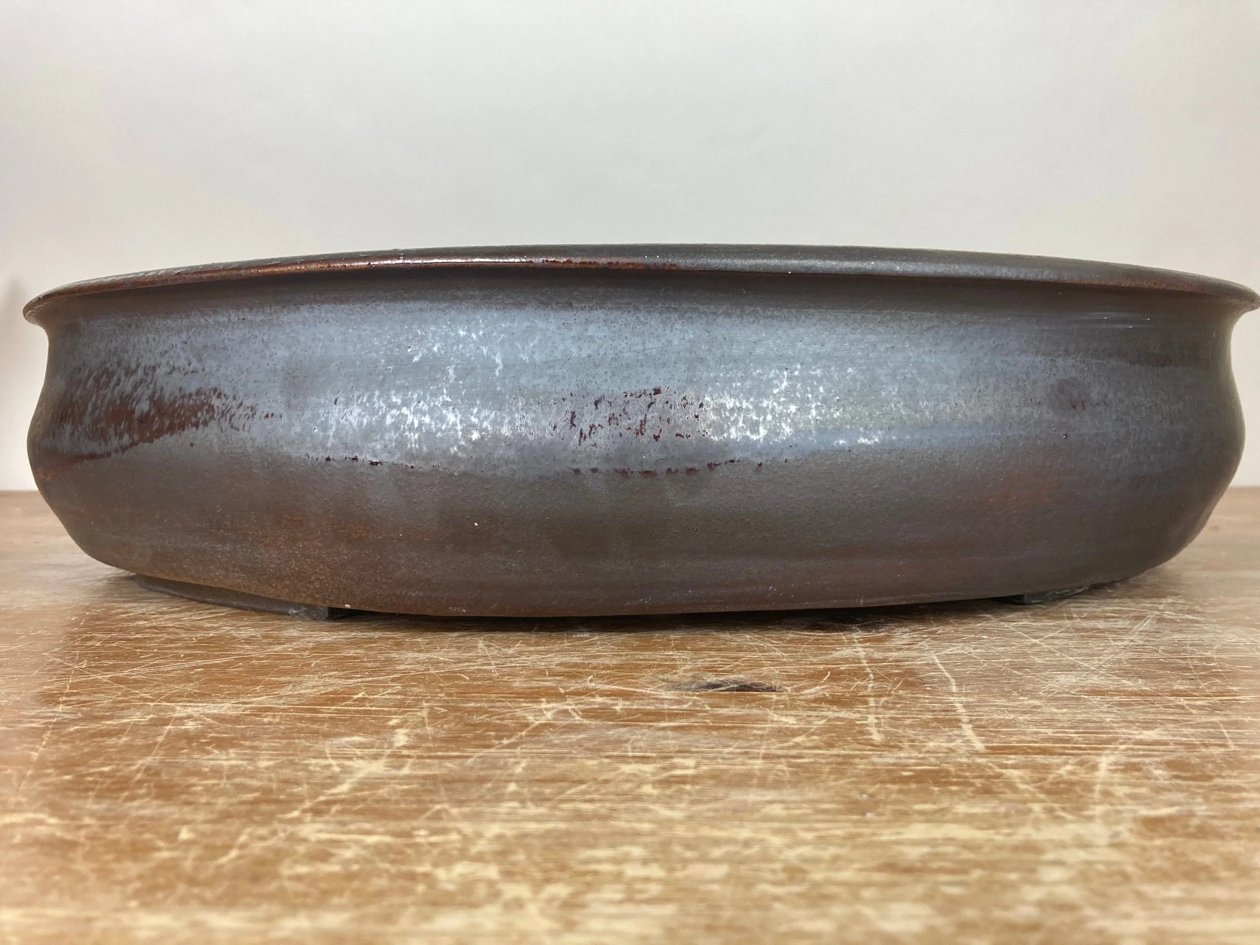 This big oval pot was stained dark brown with a semi-matte finish. Pot is 20.25 inches long, 18.5 inches wide and 4 inches tall on the outside. The planting area is 19 inches long 17 inches wide and 3.5 inches deep. The pot has five drainage holes along with plenty of tie down holes and was high fired to be frost resistant and durable for outdoor use.