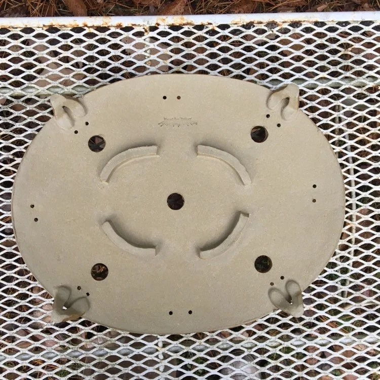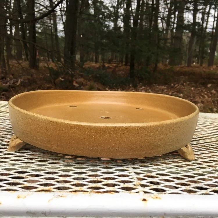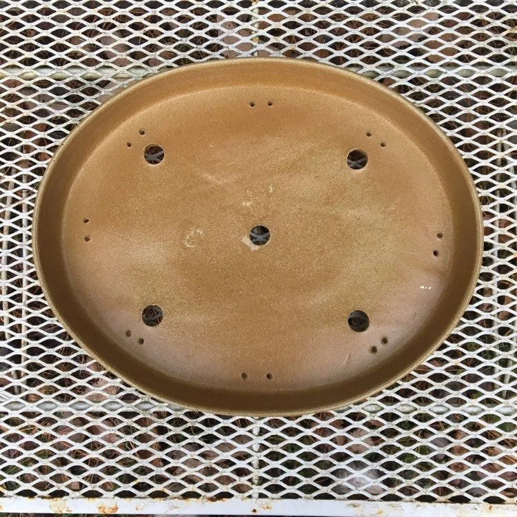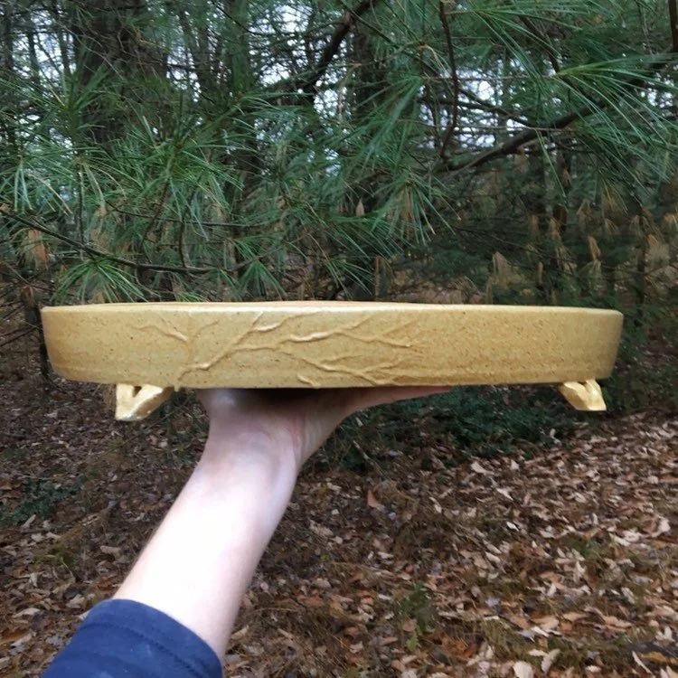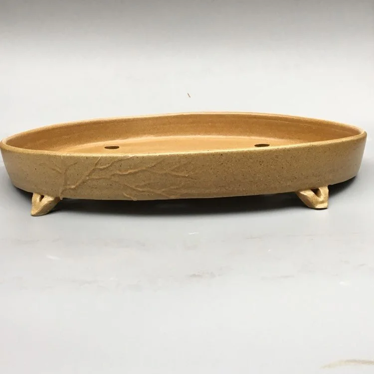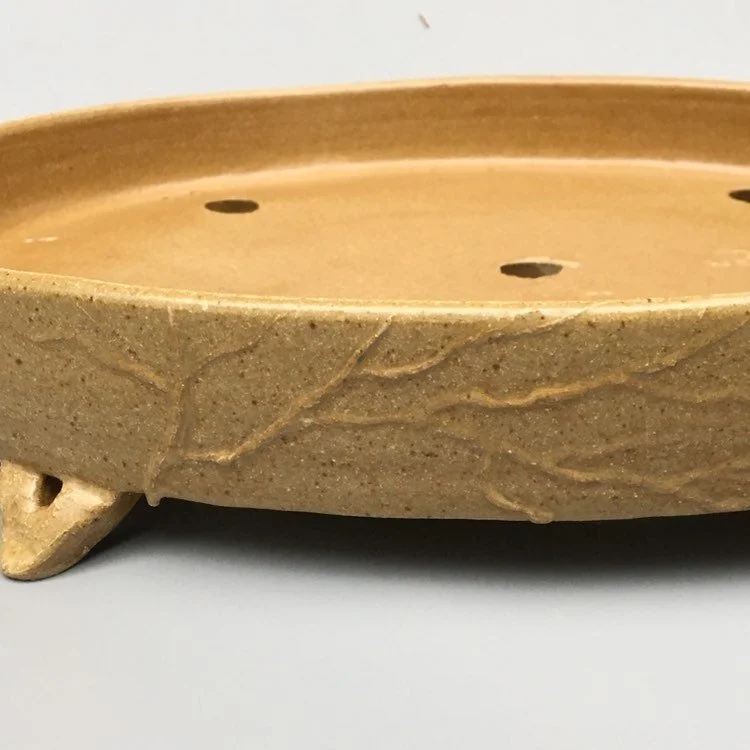 This bonsai pot has a raised tree decoration added to it. It is 15.5 inches long, 12.25 inches wide and 2.5 inches high and was high fired to be frost resistant and good for outdoor use.