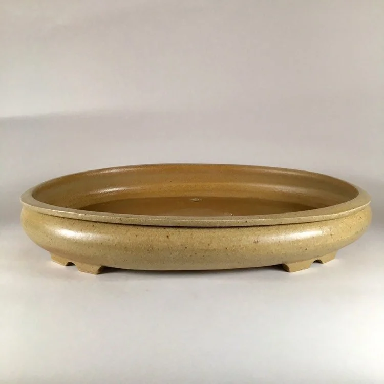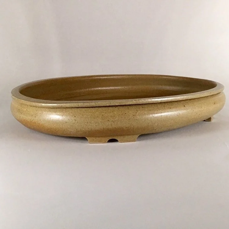 Large rimmed oval pot with a satin speckled tan color. A great pot for a more feminine style tree with a very pleasing oval shape. Pot is 16" long, 12" wide and 2.5" tall and was high fired to be frost resistant and durable for outdoor use.