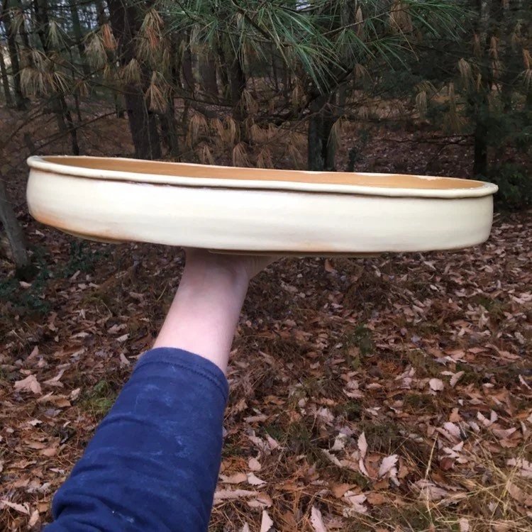 Glossy soft yellow glaze pulls away in spots to reveal patches of orange and bare clay in spots to make an imperfect look. A great pot for a more feminine style tree with a very pleasing overall shape. Pot is 17.25" long, 13" wide and 2.25" tall and was high fired to be frost resistant and durable for outdoor use.