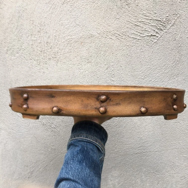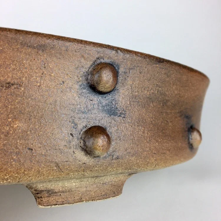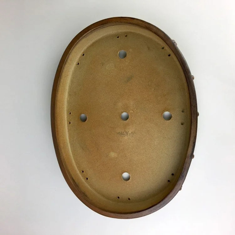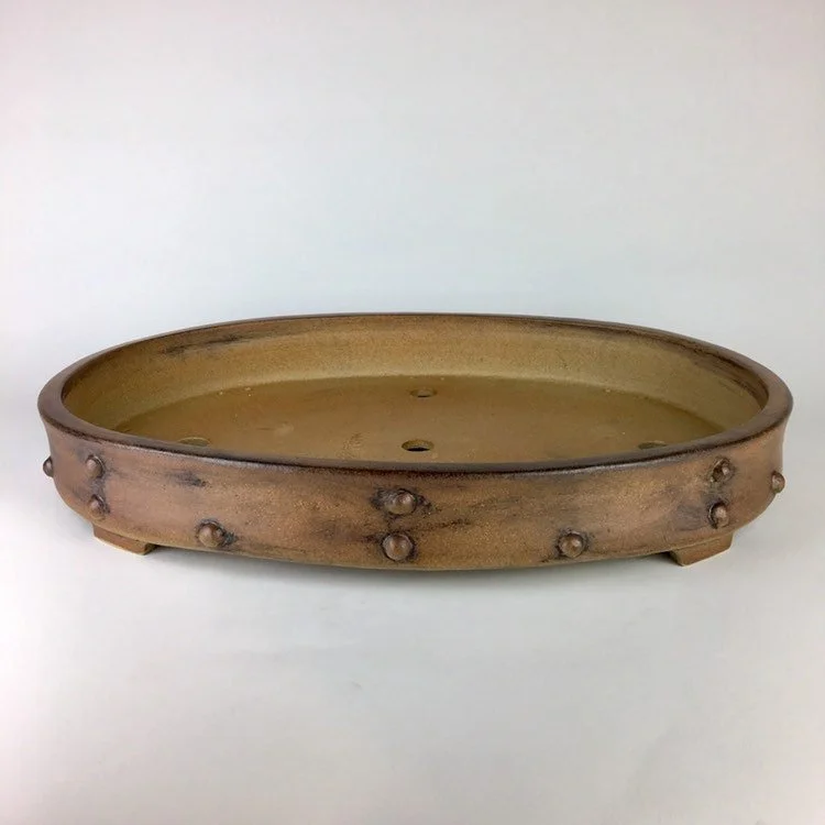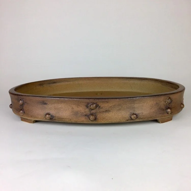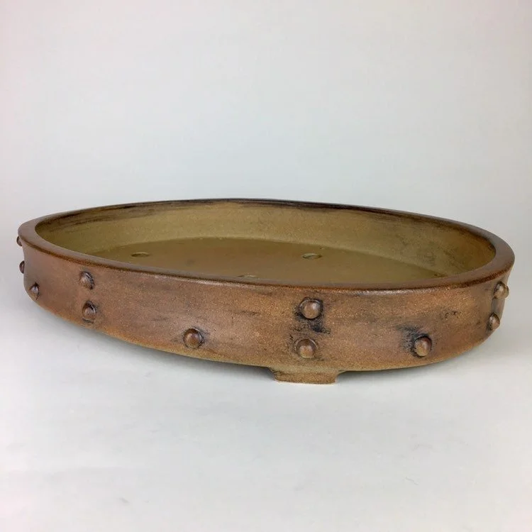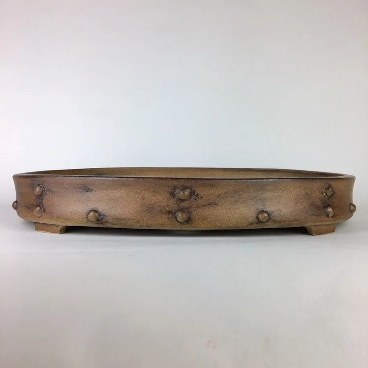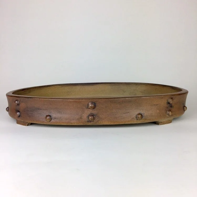 Large oval pot with a studded look. Unglazed and tough looking. Pot is 17" long, 12.5” wide and 2.25" tall and was high fired to be frost resistant and durable for outdoor use.