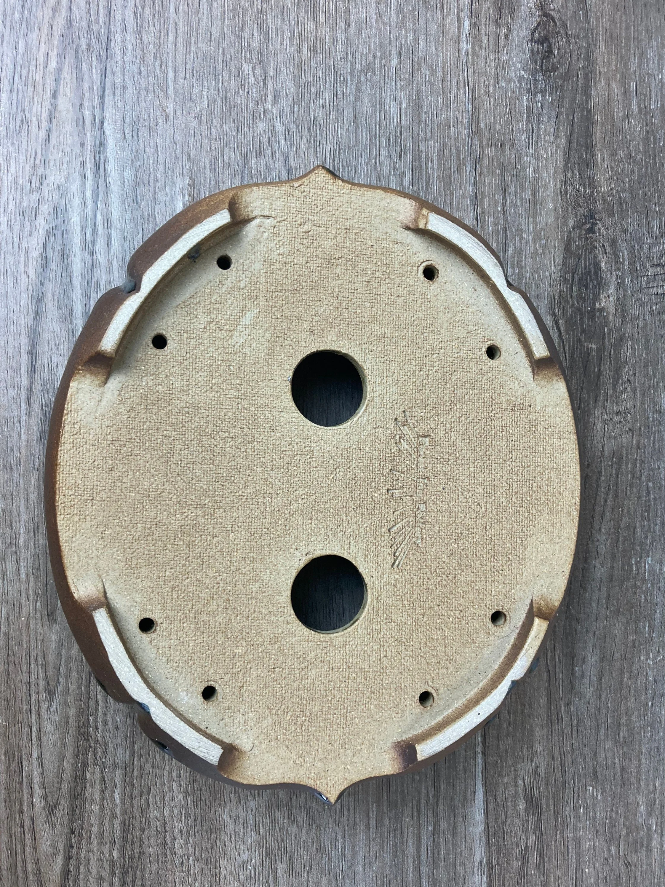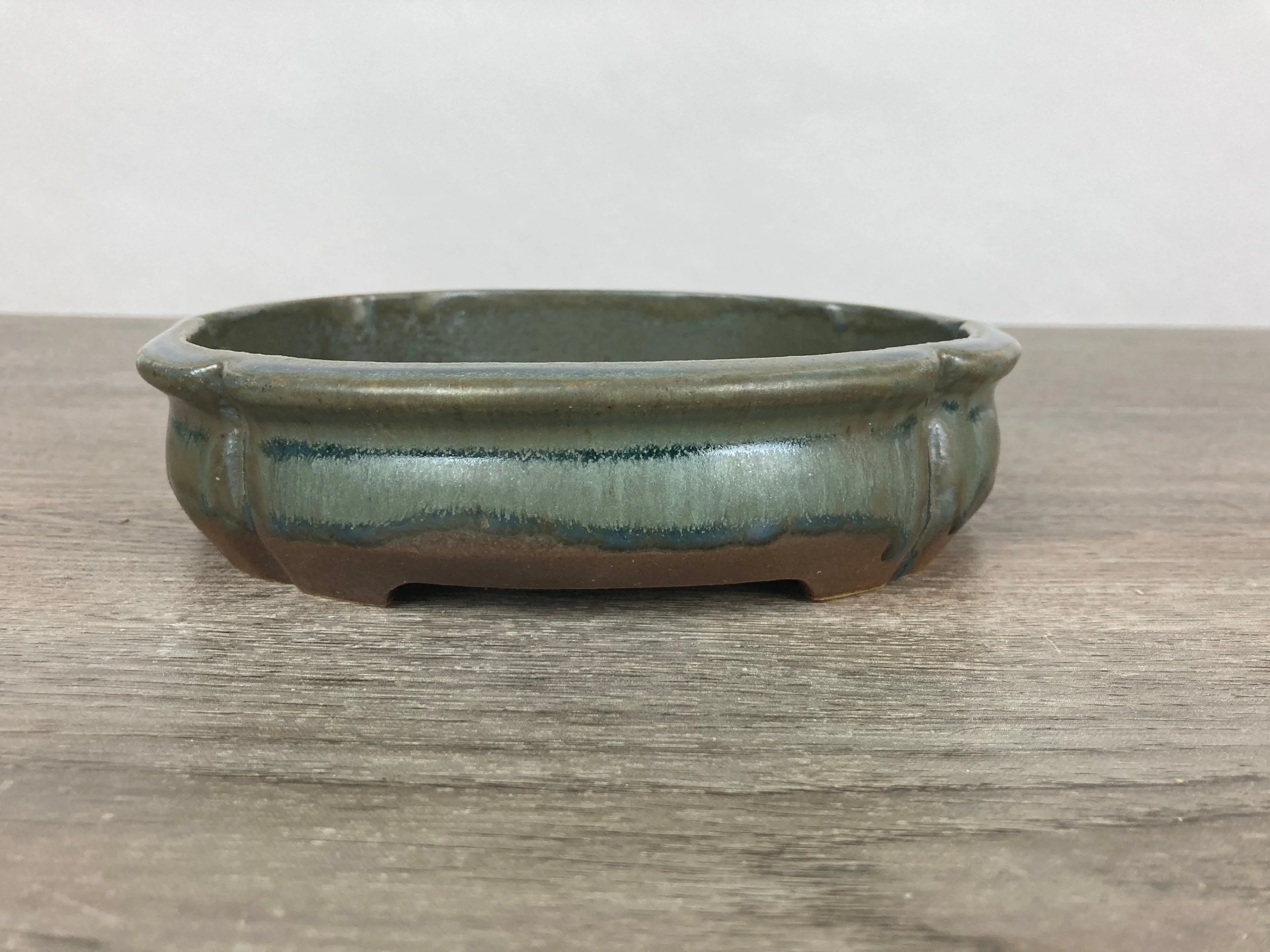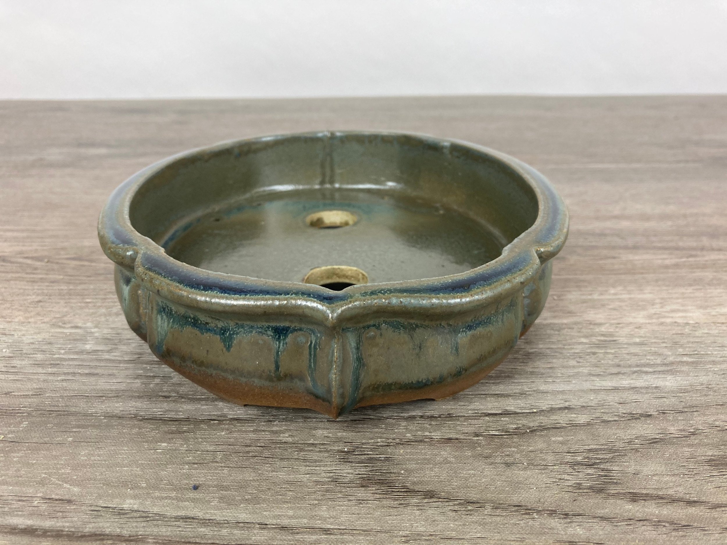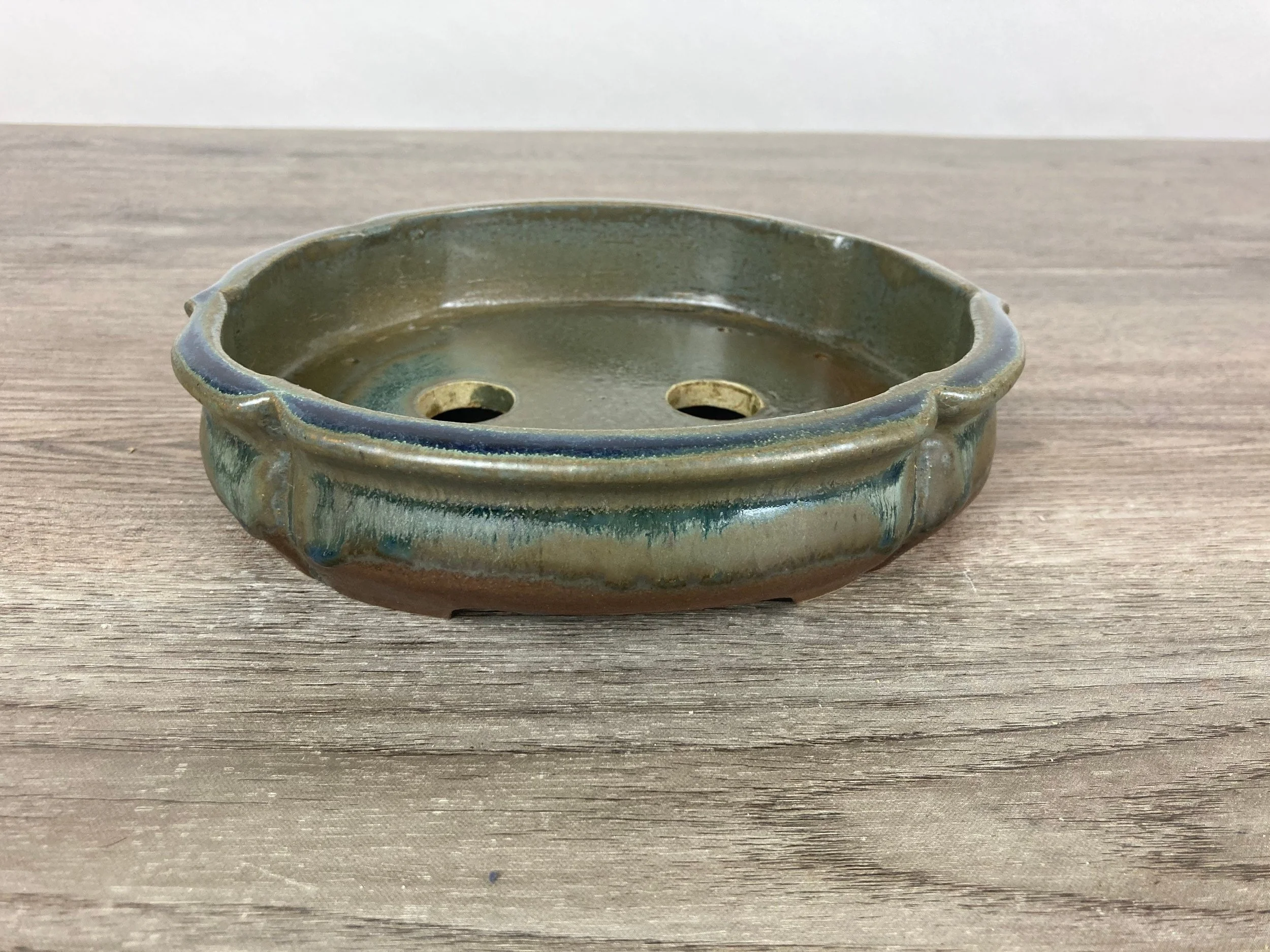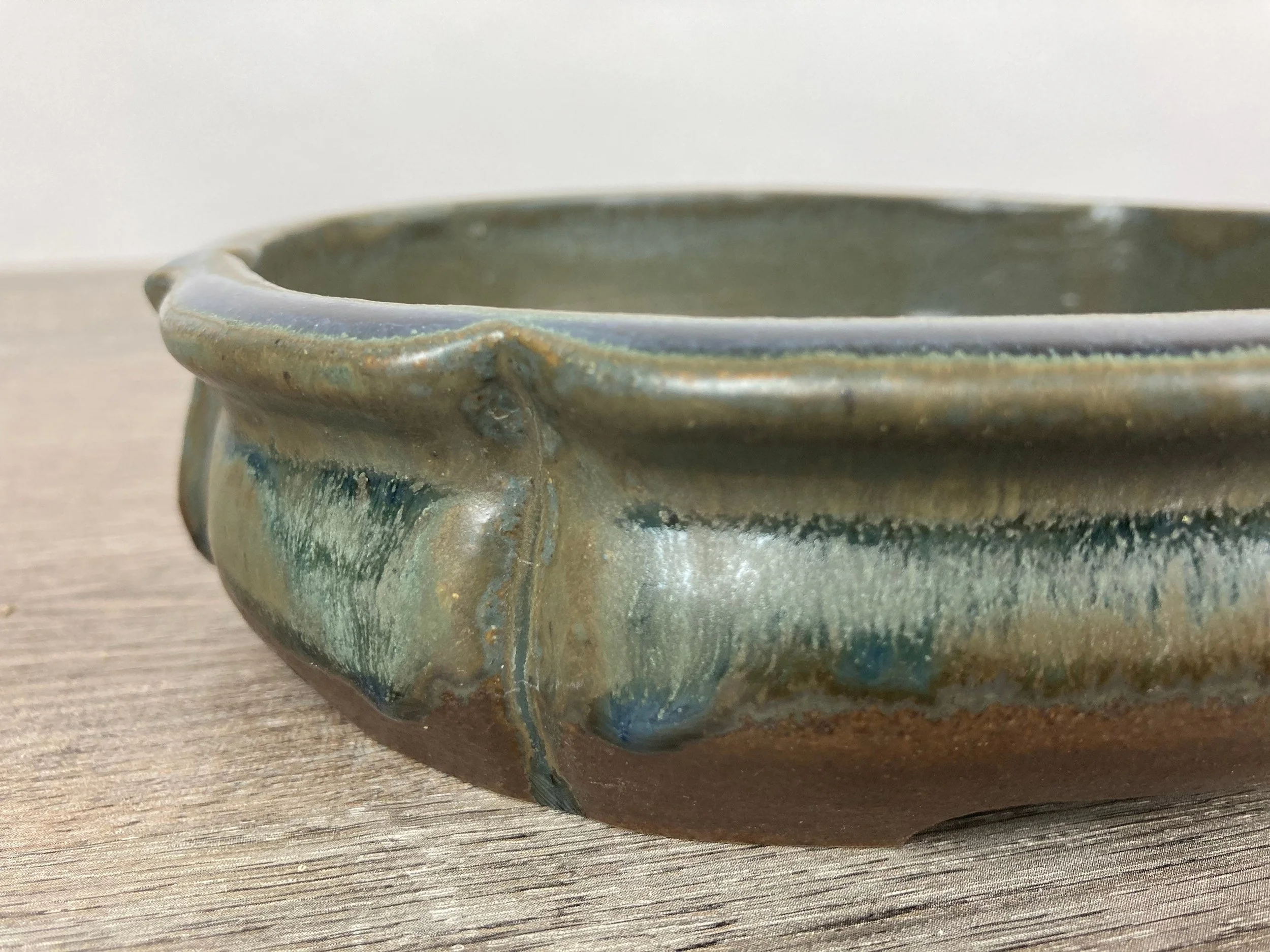 Beautiful hand carved lotus pot in a deep blue glaze with a lot of natural variation dripped over a brown stain. Pot is 7.25" long, 6.5" wide and 1.75" tall overall and the inside planting area is 6.5" long, 5.5" wide and 1" deep. It was high fired to be frost resistant and durable for outdoor use.