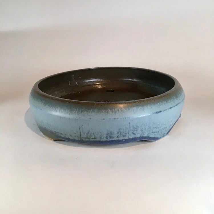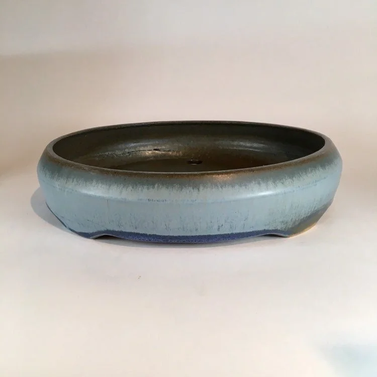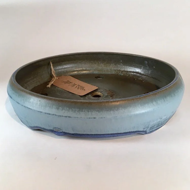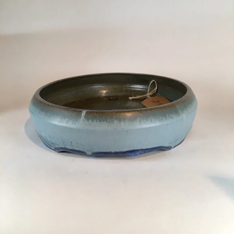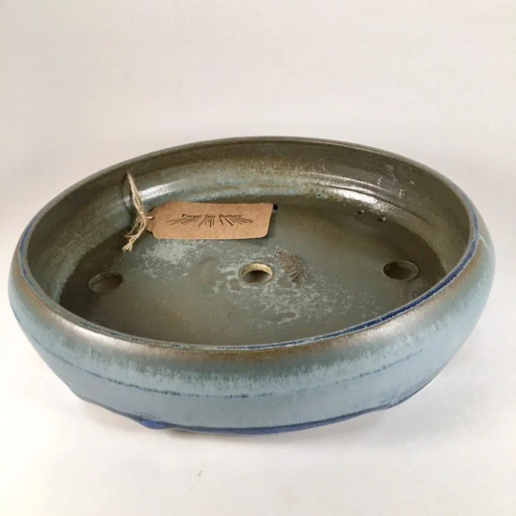 Matte blue green glaze that breaks to dark brown on edges gives this pot a naturally messy vibe. There is one spot on it where the glaze pulled away leaving a bare spot (The first picture shows the spot). Depending on preference, this spot can be used in the front for added interest, or hidden in the back depending on the look you prefer. Pot is 11" long, 9.5" wide and 2.5" tall and was high fired to be frost resistant and durable for outdoor use.
