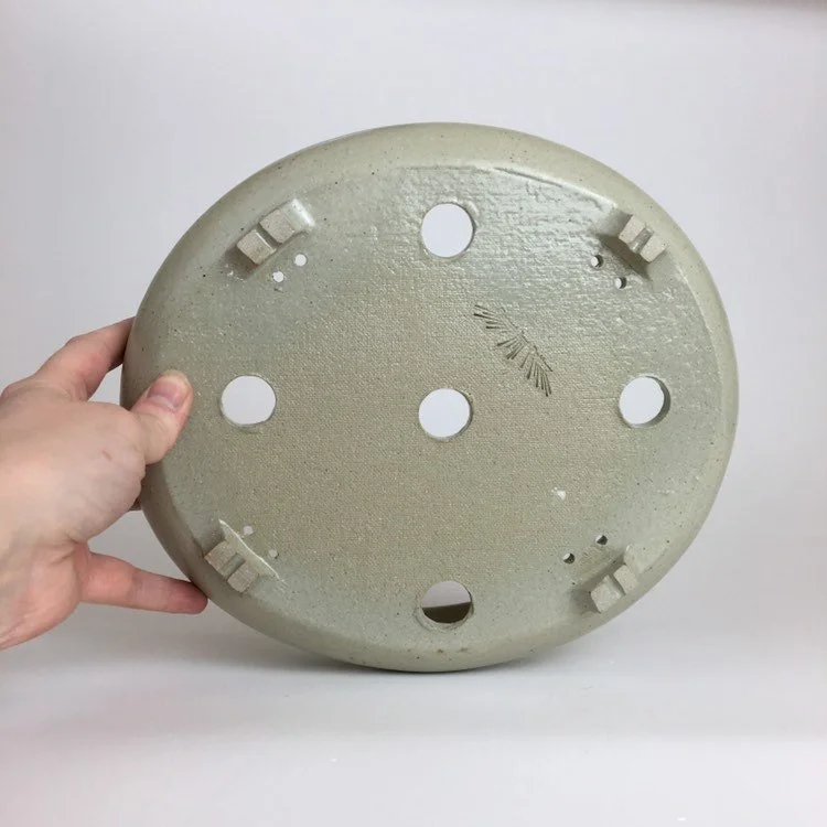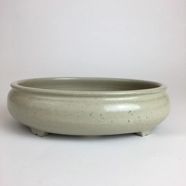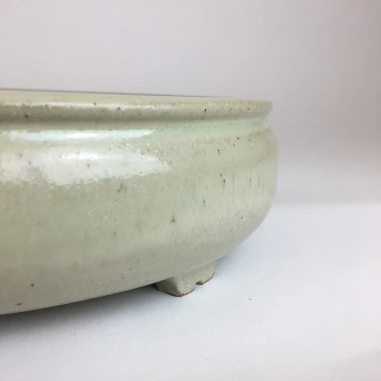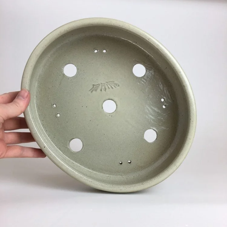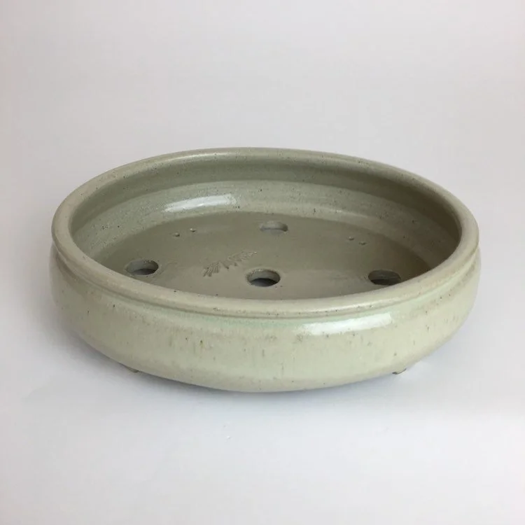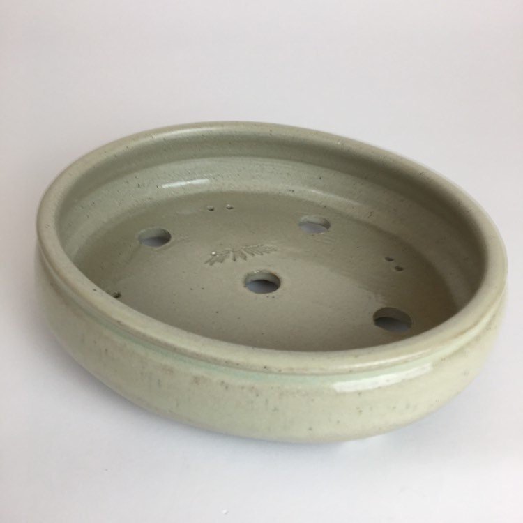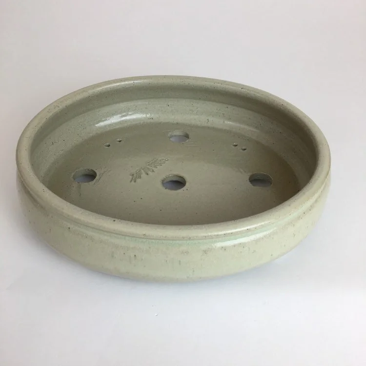 Glossy pale cream colored glaze with a hint of green for a more feminine style tree. Pot is 10" long, 9" wide and 2.5" tall and was high fired to be frost resistant and durable for outdoor use.