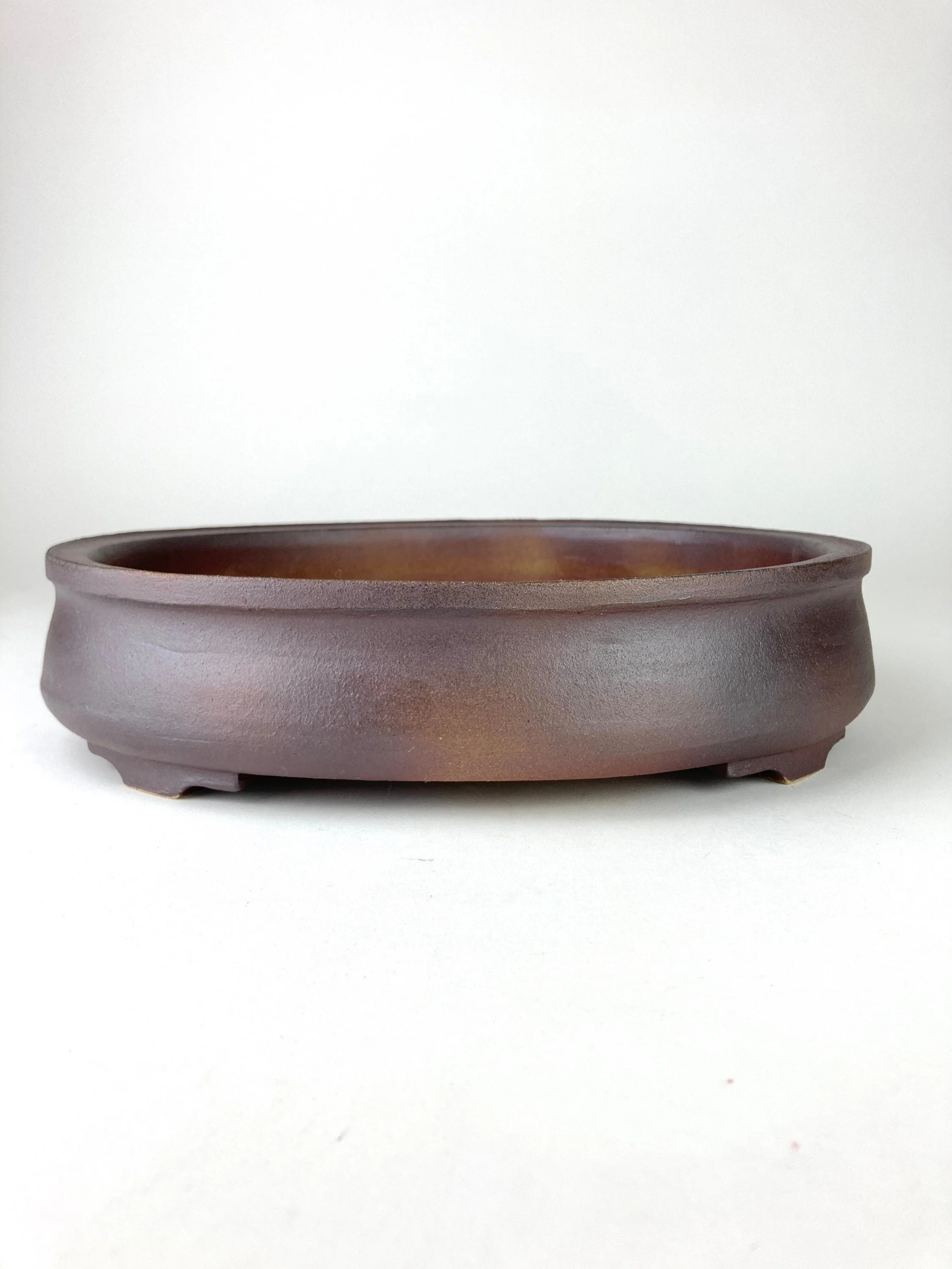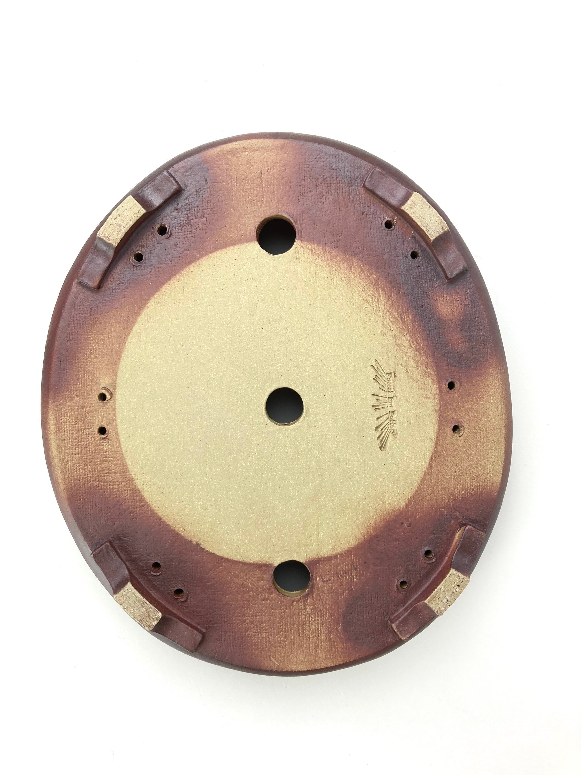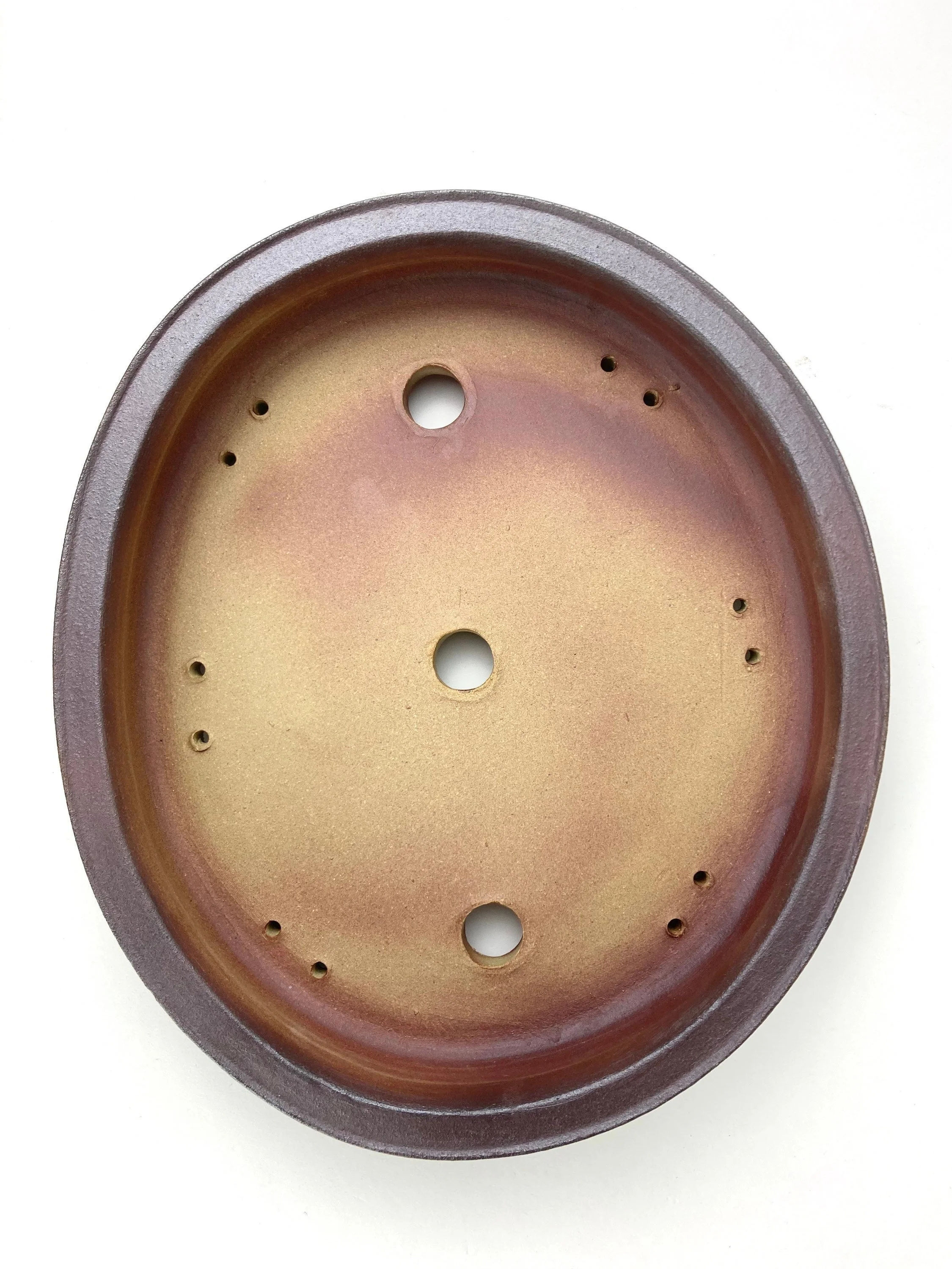 This oval bonsai pot was coated with an iron stain for coloring. Pot is 10.5" long, 9.25" wide and 2.50" tall and was high fired to be frost resistant and durable for outdoor use.
