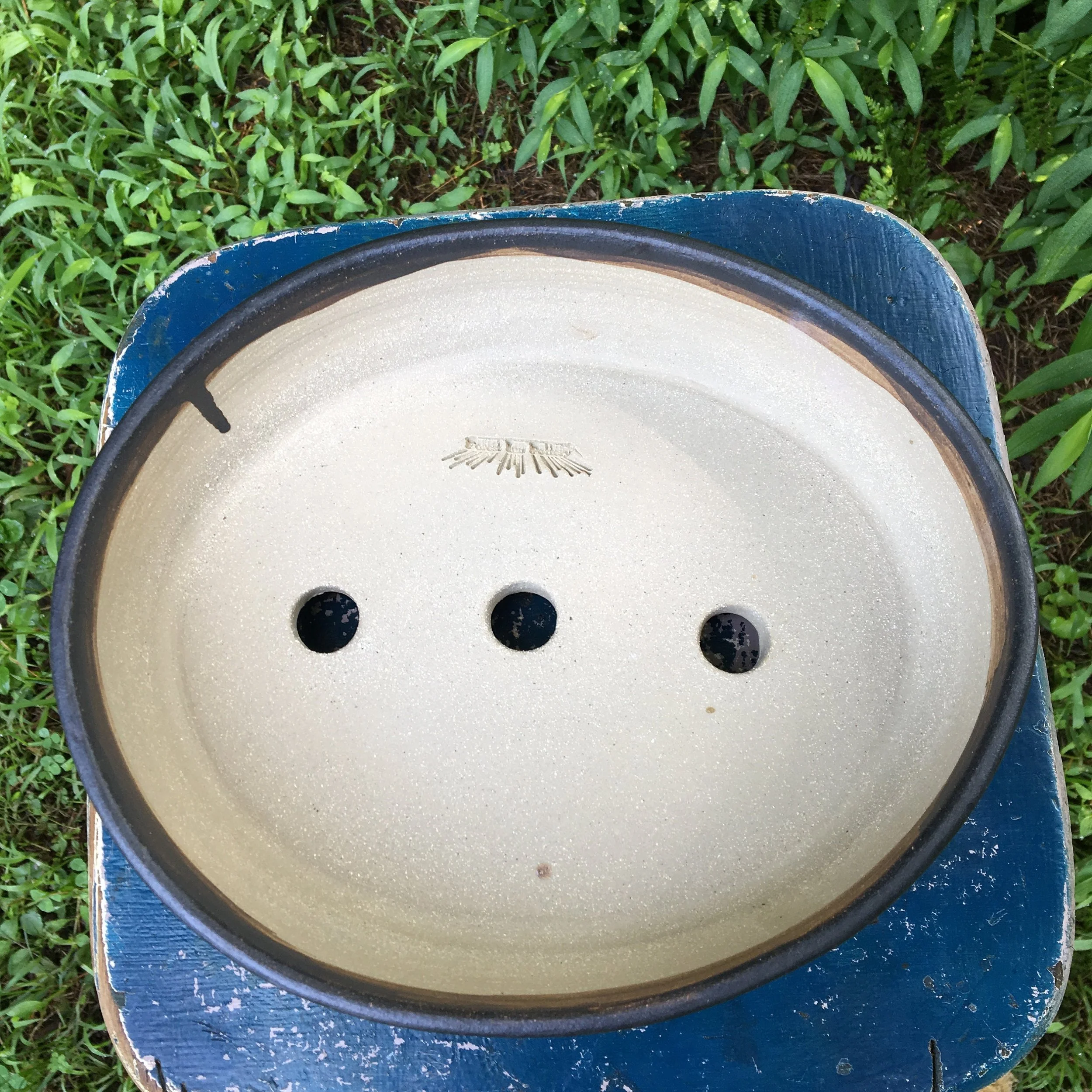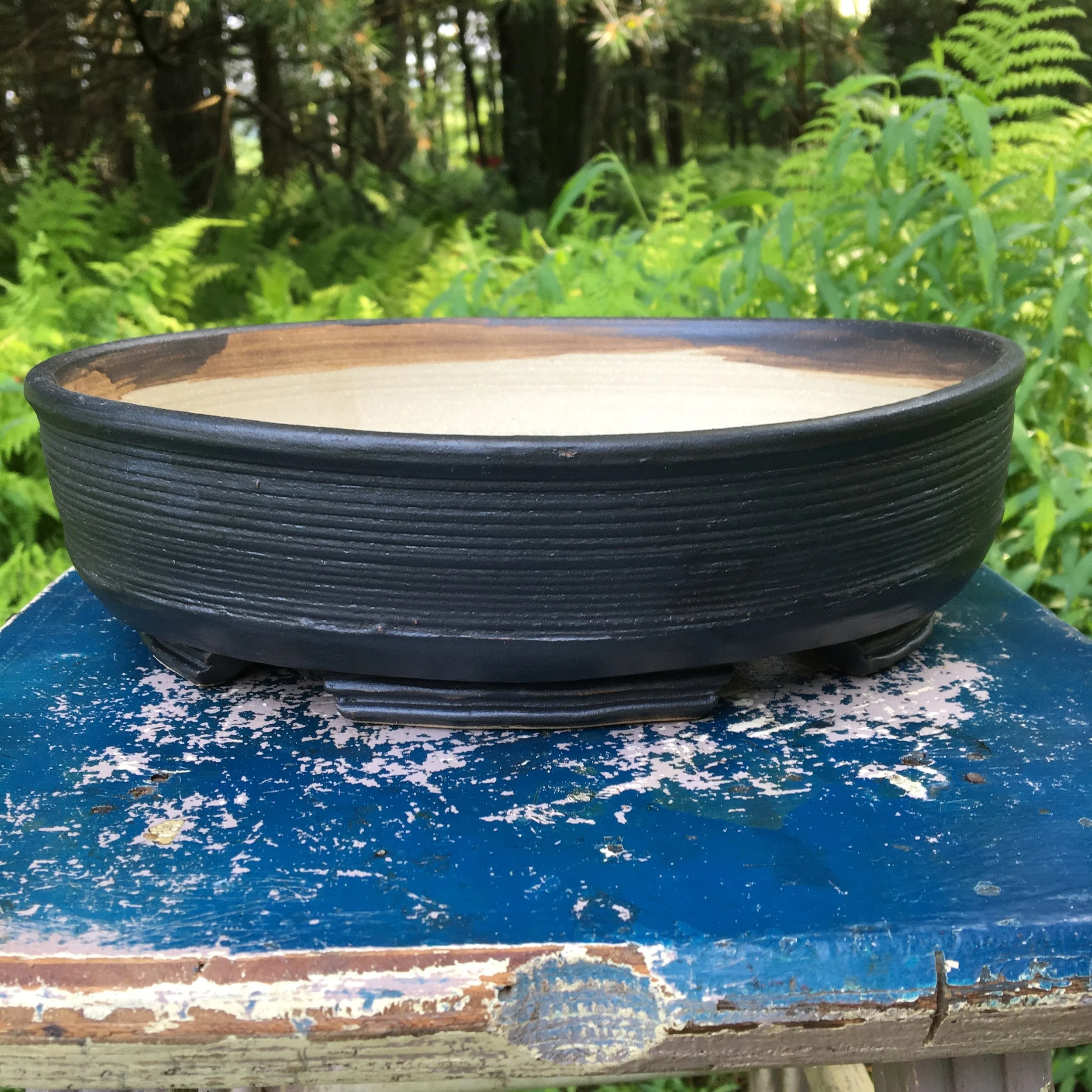 Rough textured matte black pot with horizontal grooves around it. It's a nice tough looking pot that was high fired to be frost resistant and durable. This is a Medium sized oval bonsai pot with three drain holes measuring 9.5 inches long, 8 inches wide and 3 inches high.
