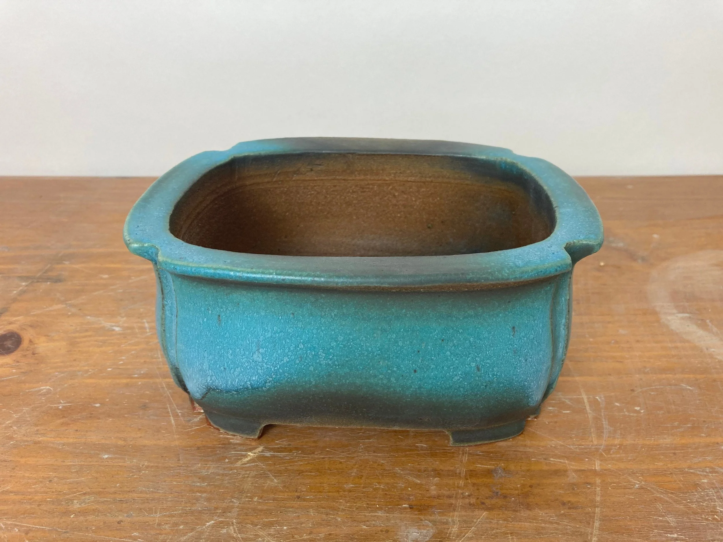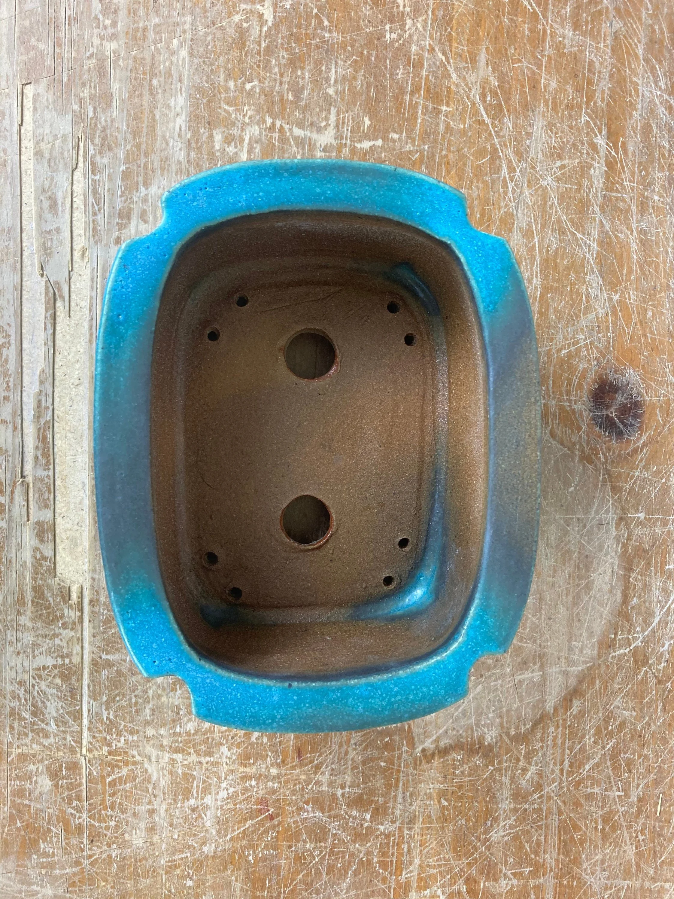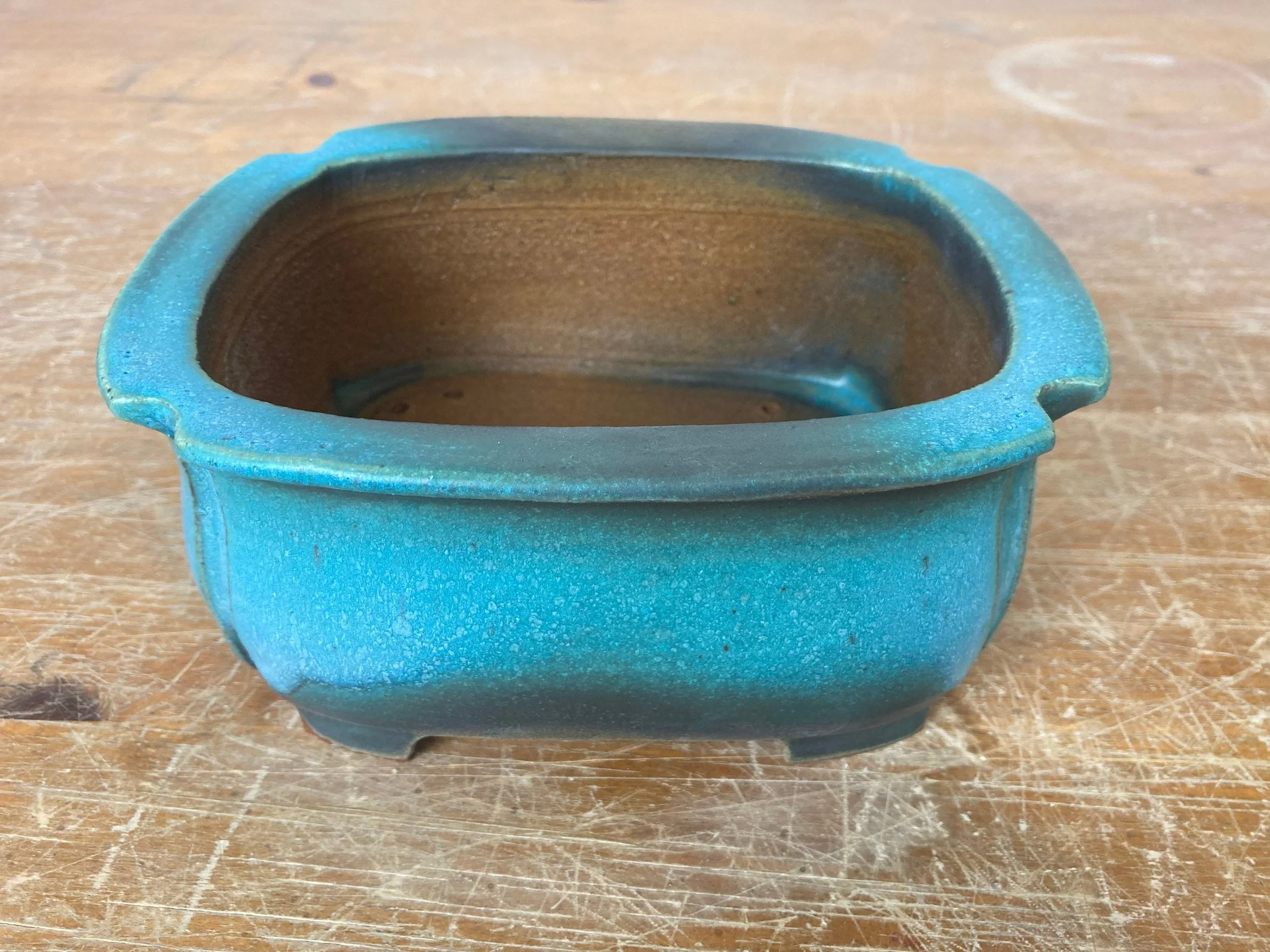 Beautiful hand carved pot in a bold blue glaze with a lot of natural variation. Exterior dimensions are 7 inches long, 5.5 inches wide and 3.25 inches tall. The planting area is 5.75 inches long, 4.25 inches wide and 2.5 inches deep. It has two drainage holes along with tie down holes and was high fired to be frost resistant and durable for outdoor use.