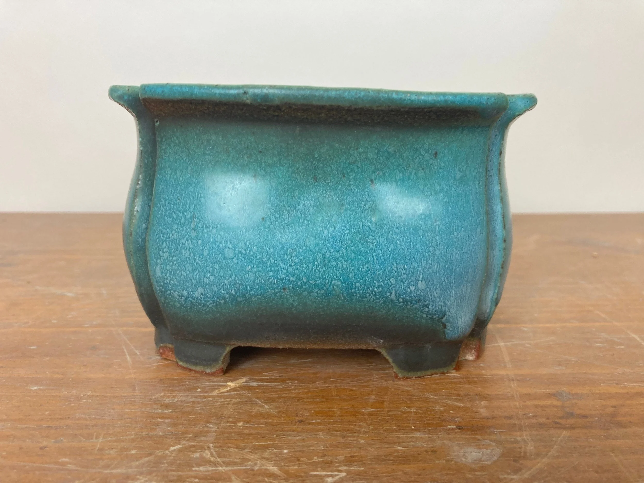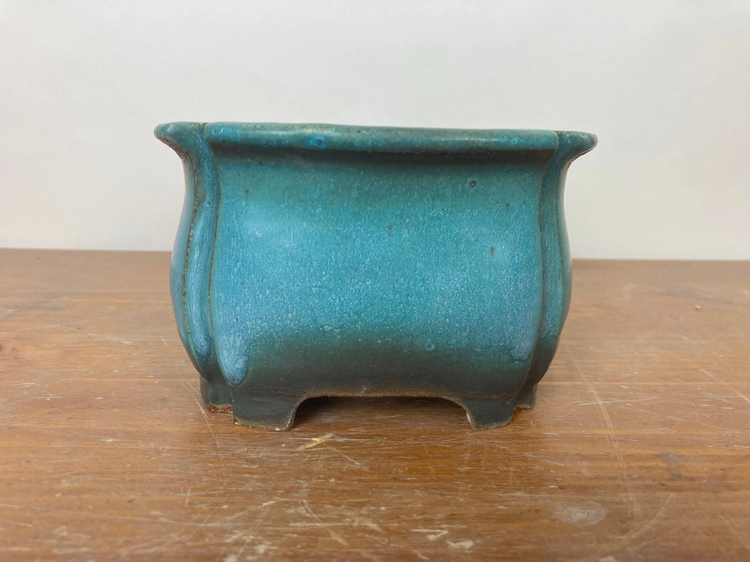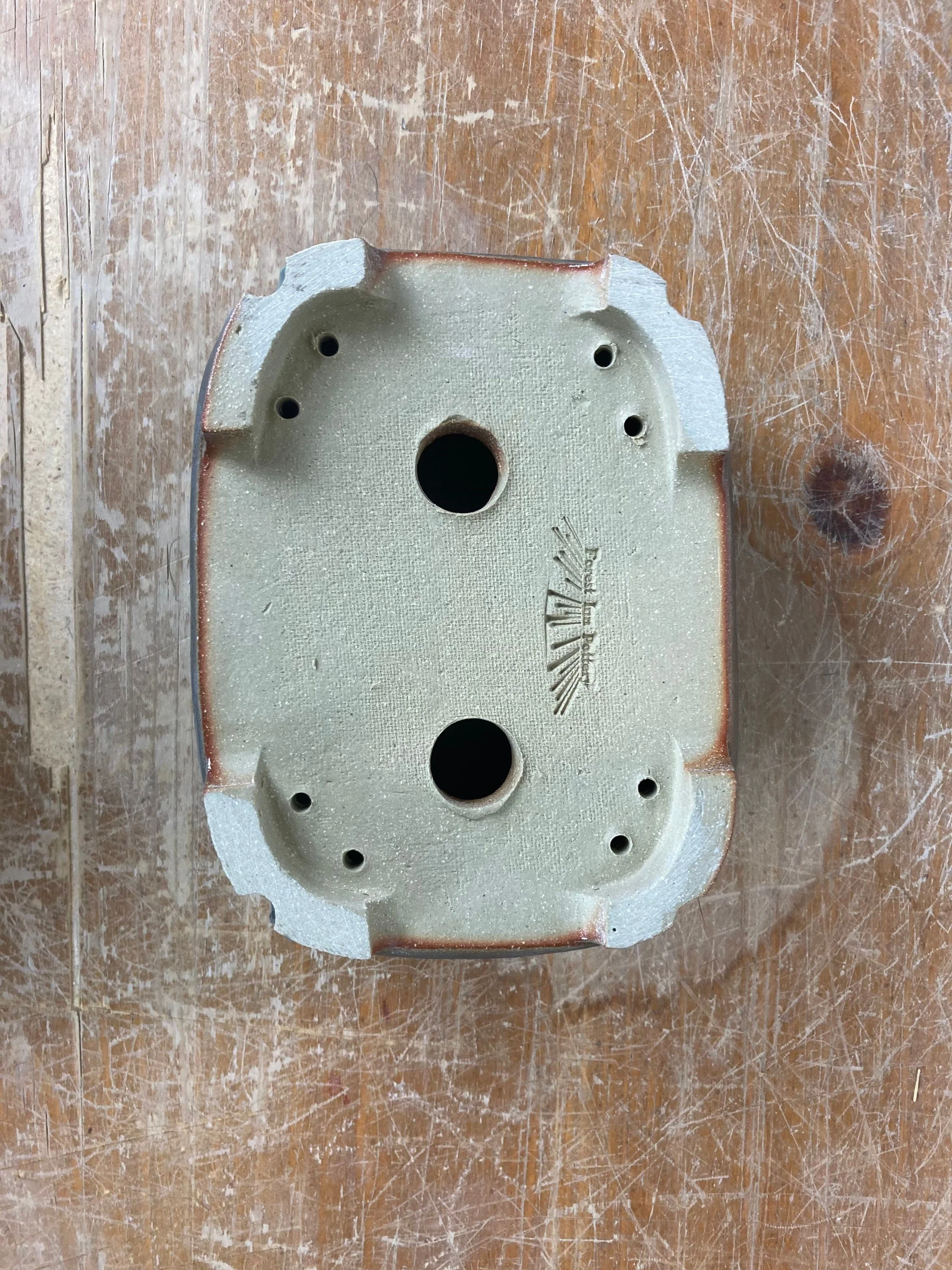 Beautiful hand carved pot in a bold blue glaze with a lot of natural variation. Exterior dimensions are 7 inches long, 5.5 inches wide and 3.25 inches tall. The planting area is 5.75 inches long, 4.25 inches wide and 2.5 inches deep. It has two drainage holes along with tie down holes and was high fired to be frost resistant and durable for outdoor use.