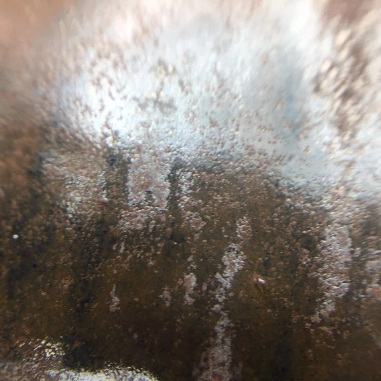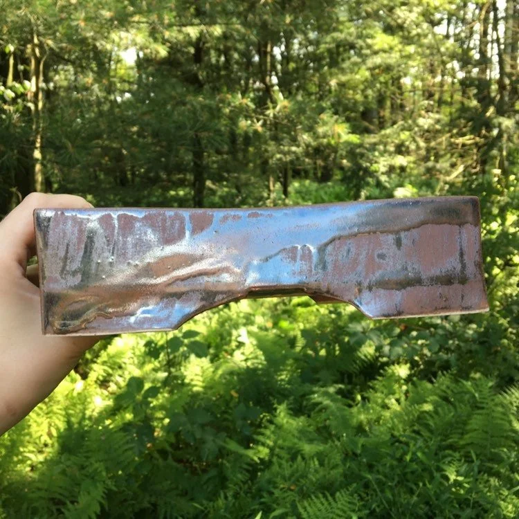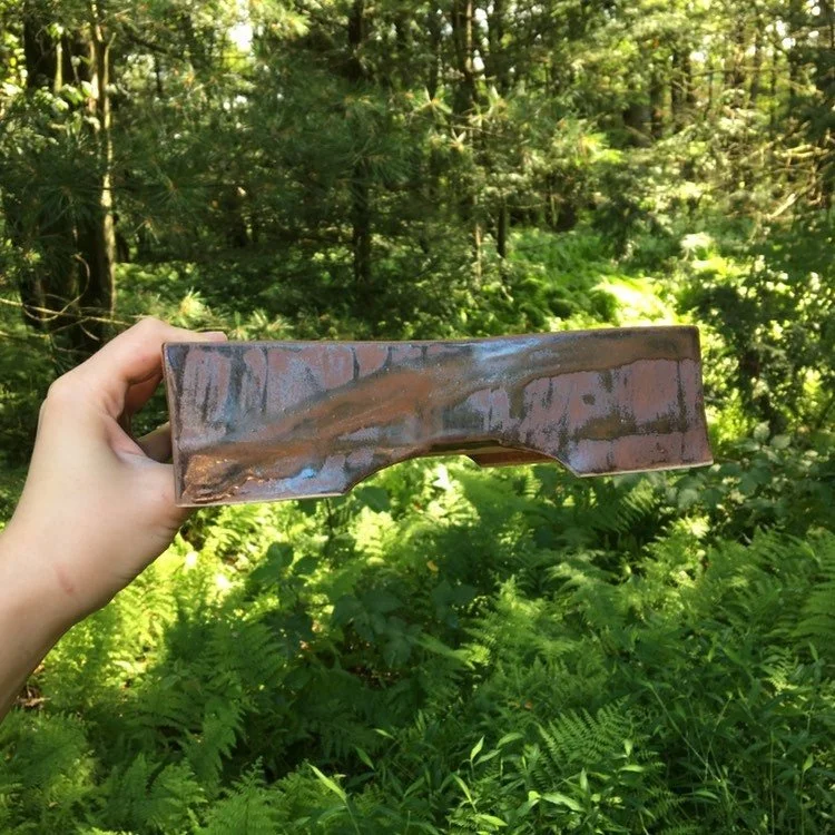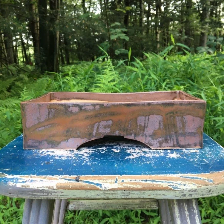 Small rectangle pot with a rusty reddish semigloss glaze with brick red glossy stripe on each side. The sides of this pot are slightly warped and bow in a little on the sides. Still a great looking frost resistant and durable pot. This Medium sized rectangle bonsai pot has three drain holes and six small holes to tie down your bonsai. This pot has been made by hand, so expect character, not perfection. Pot is 9" long, 7" wide and 5" tall. It has been high fired to be frost resistant, so it is good for outdoor use in cold climates.