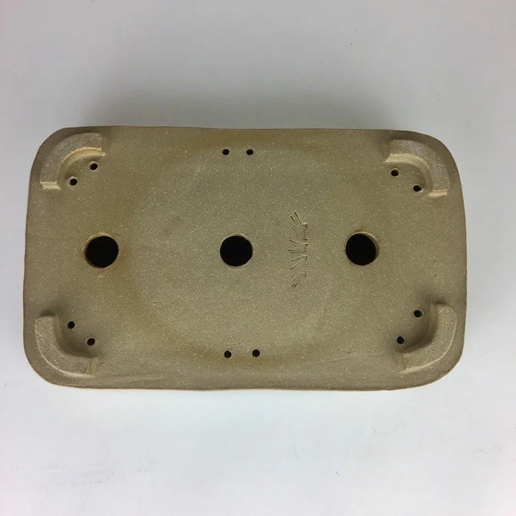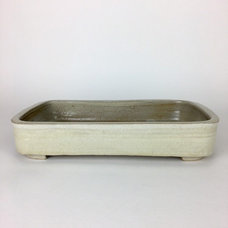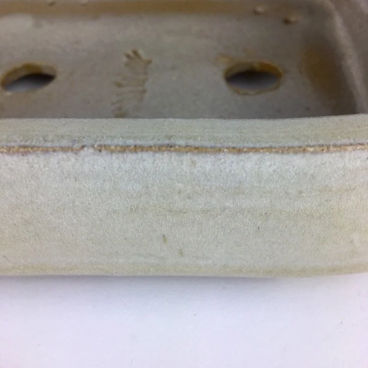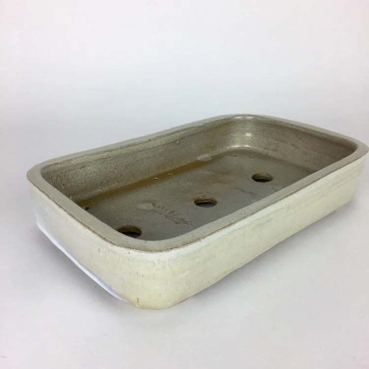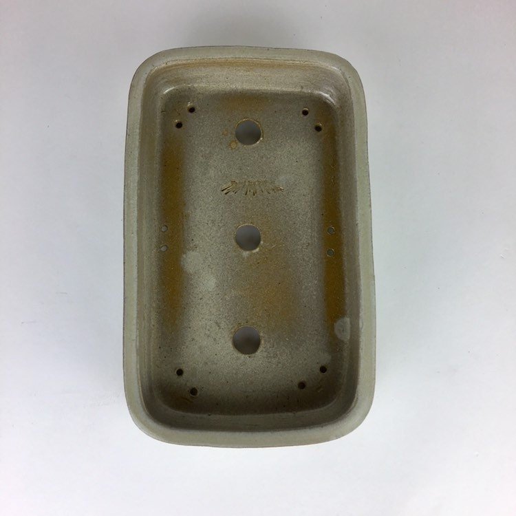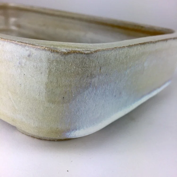 A glossy variegated light brown glaze with great depth is used on this overall simple pot. Pot is 9.5” long, 8.25” wide and 2.25” tall and was high fired to be frost resistant and durable for outdoor use.