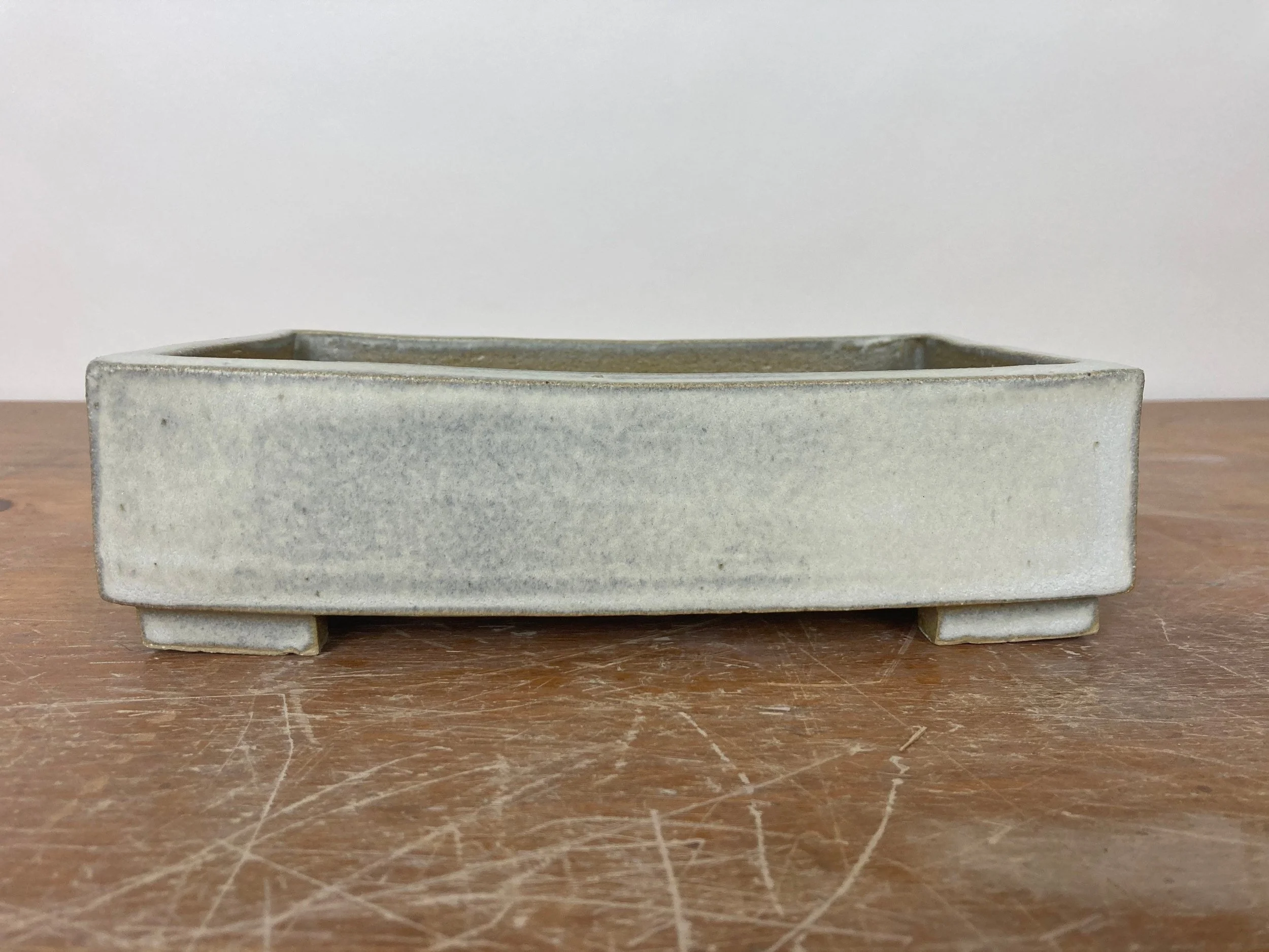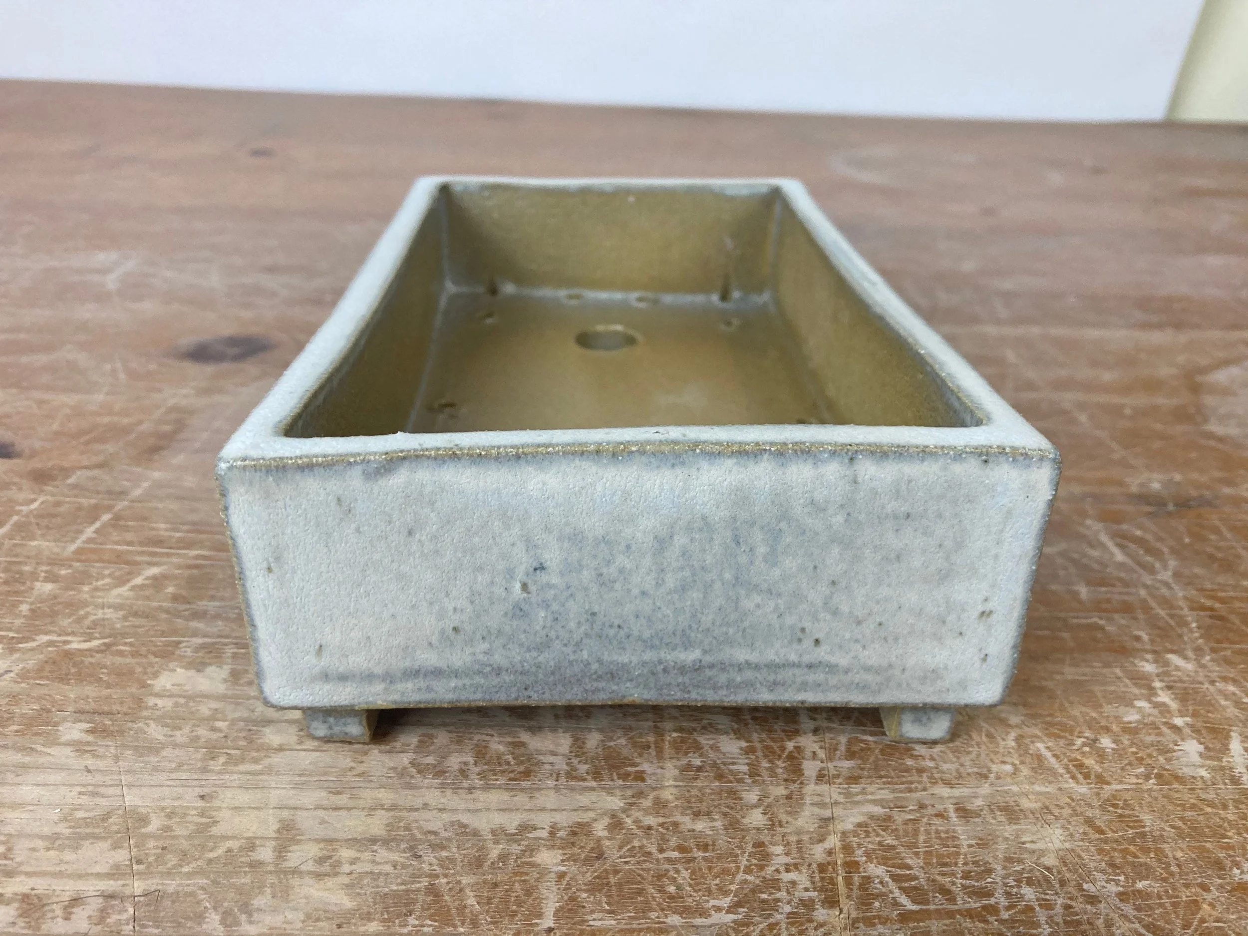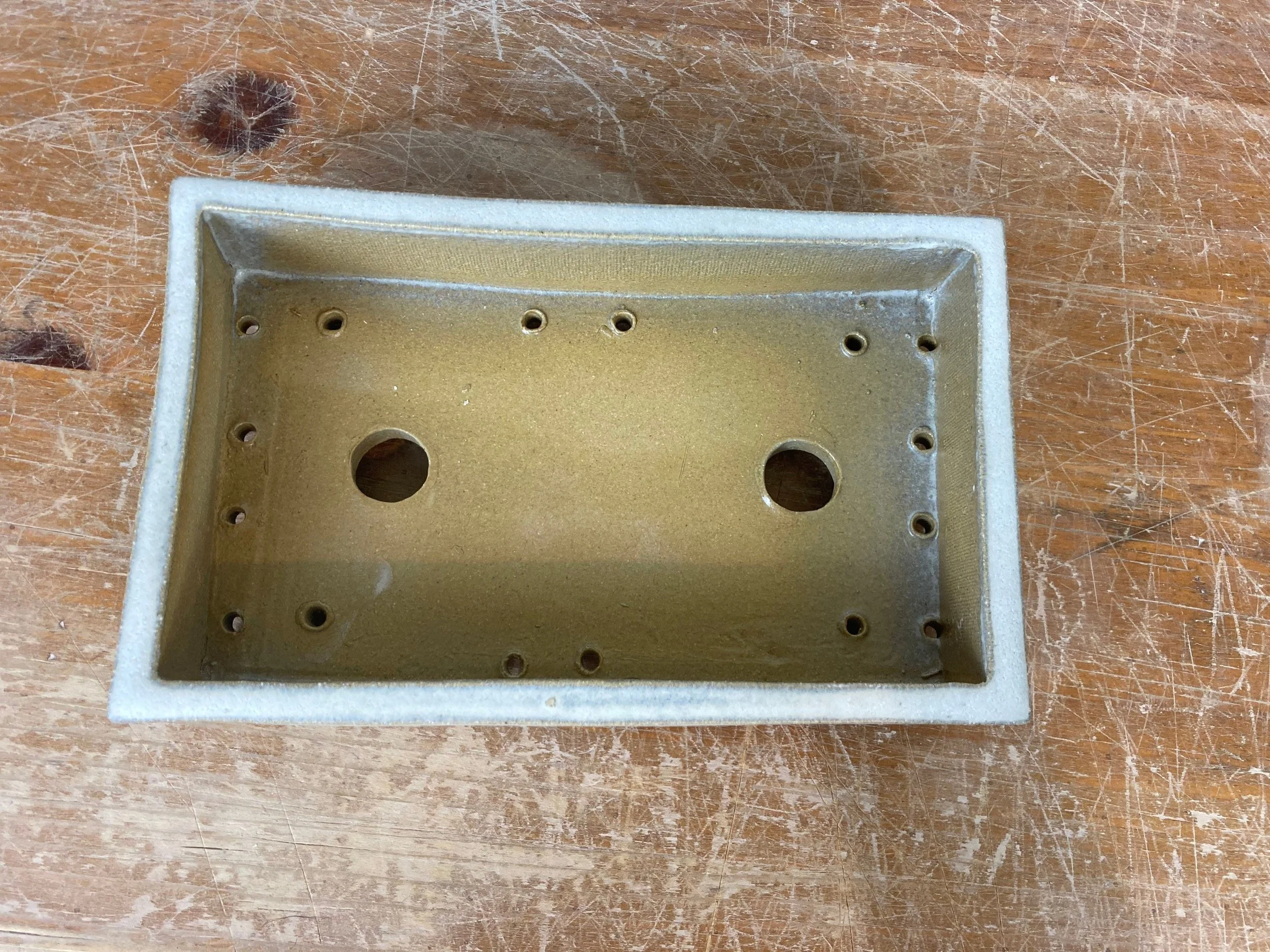 This pale white rectangular pot can be used for a small bonsai, kusamono or shitakusa or whatever you would like to plant in it. This little pot was high fired making it frost resistant and durable. It is 7.5 inches long, 4.75 inches wide and 2 inches tall on the outside. The planting area is 6.75 inches long, 4 inches wide, and 1.5 inches deep.