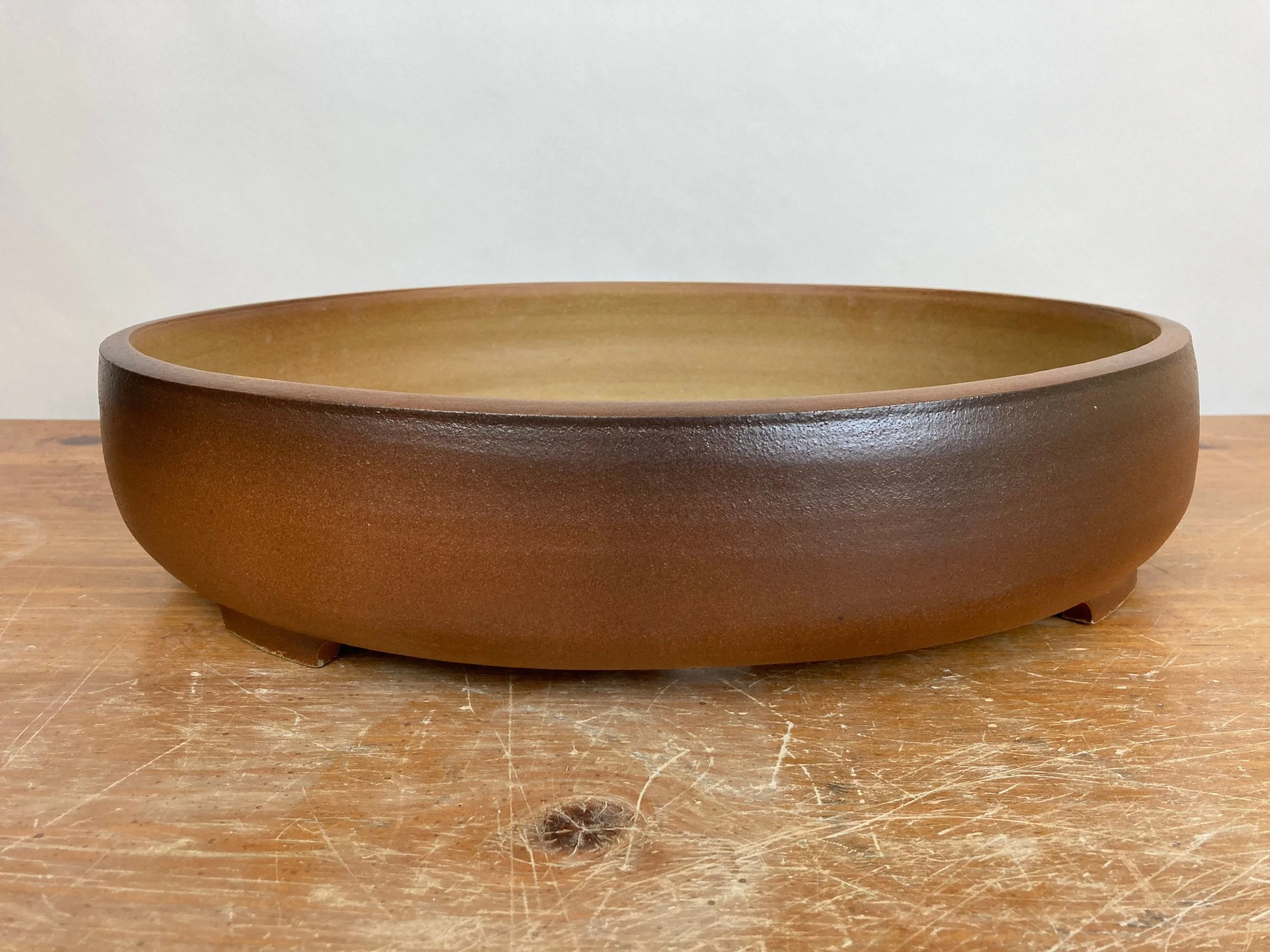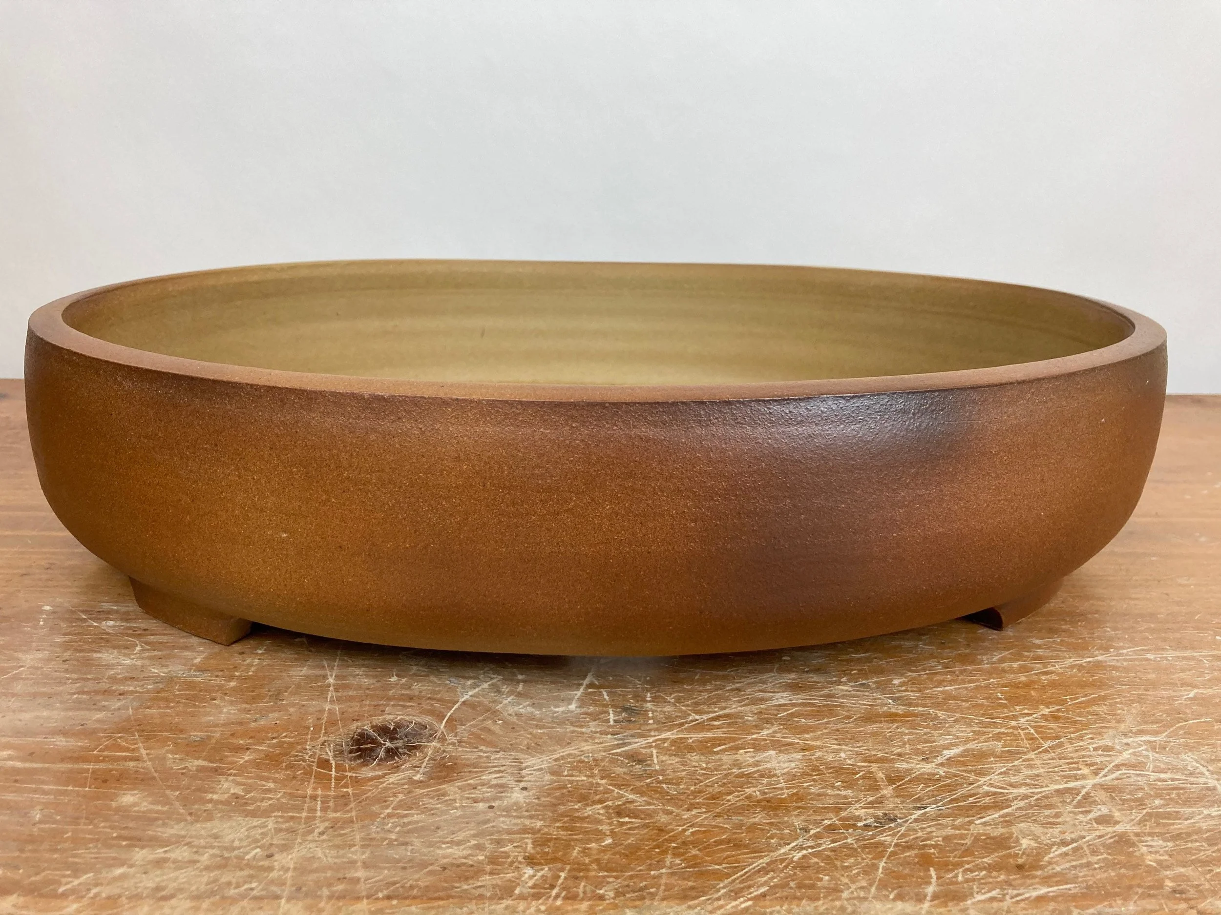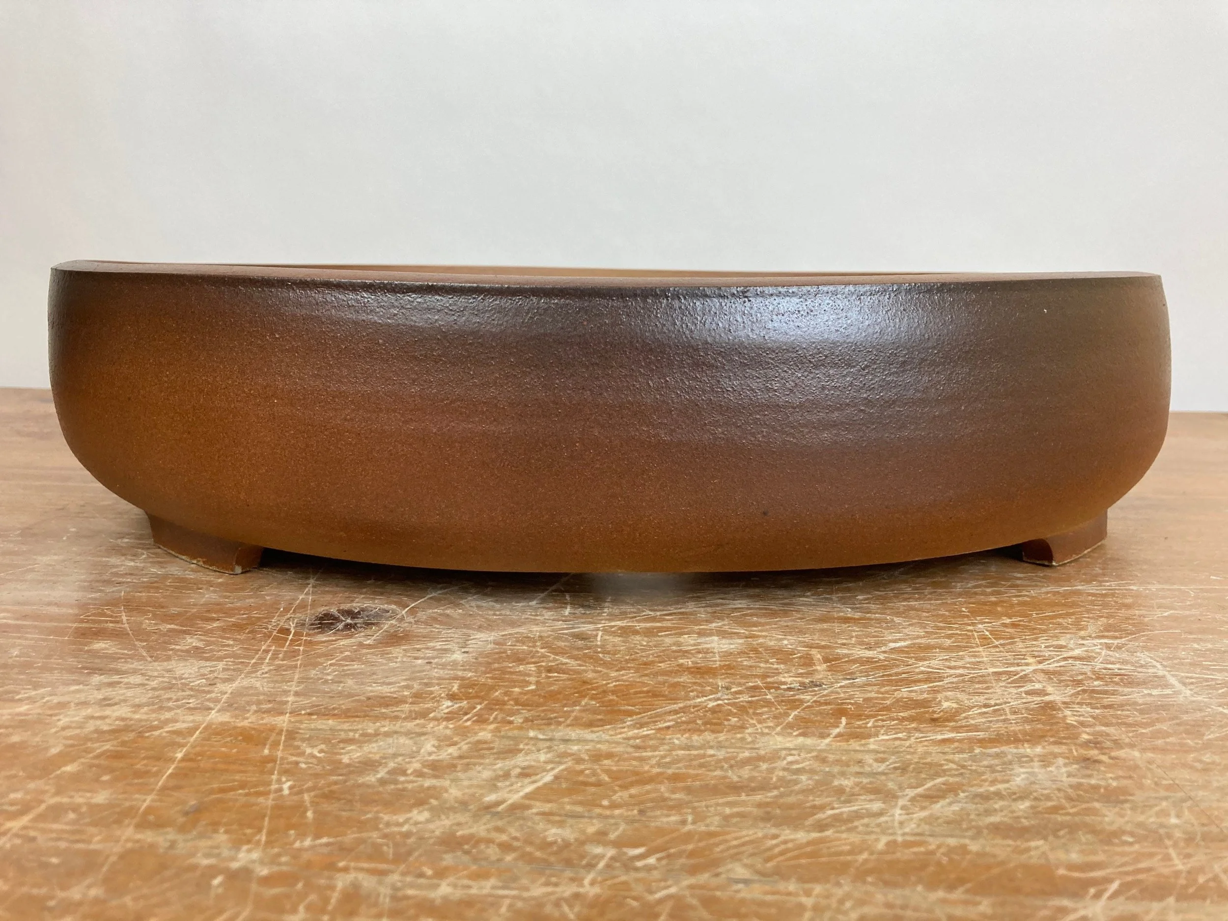 This big oval pot was stained reddish brown with a matte finish. This is a large sized oval bonsai pot with five drain holes and plenty of smaller tie down holes to help secure the tree in the pot. The exterior dimensions are 16 inches long, 13.75 inches wide and 3.5 inches high. The planting area inside is 15 inches long, 12.75 inches wide and 2.75 inches deep. was high fired to be frost resistant and durable for outdoor use.