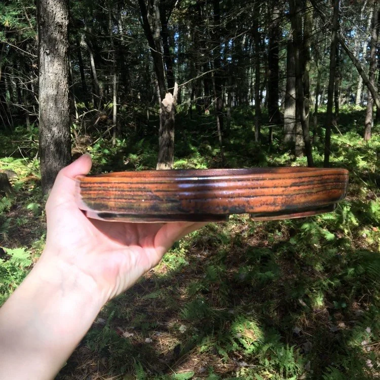This pot is naturally uneven oval shape with a rusty looking glaze on it. Measuring 9.25 inches long, 7.25 inches wide and 1.5 inches high. It has been high fired to make it good for outdoor use even through the winter.