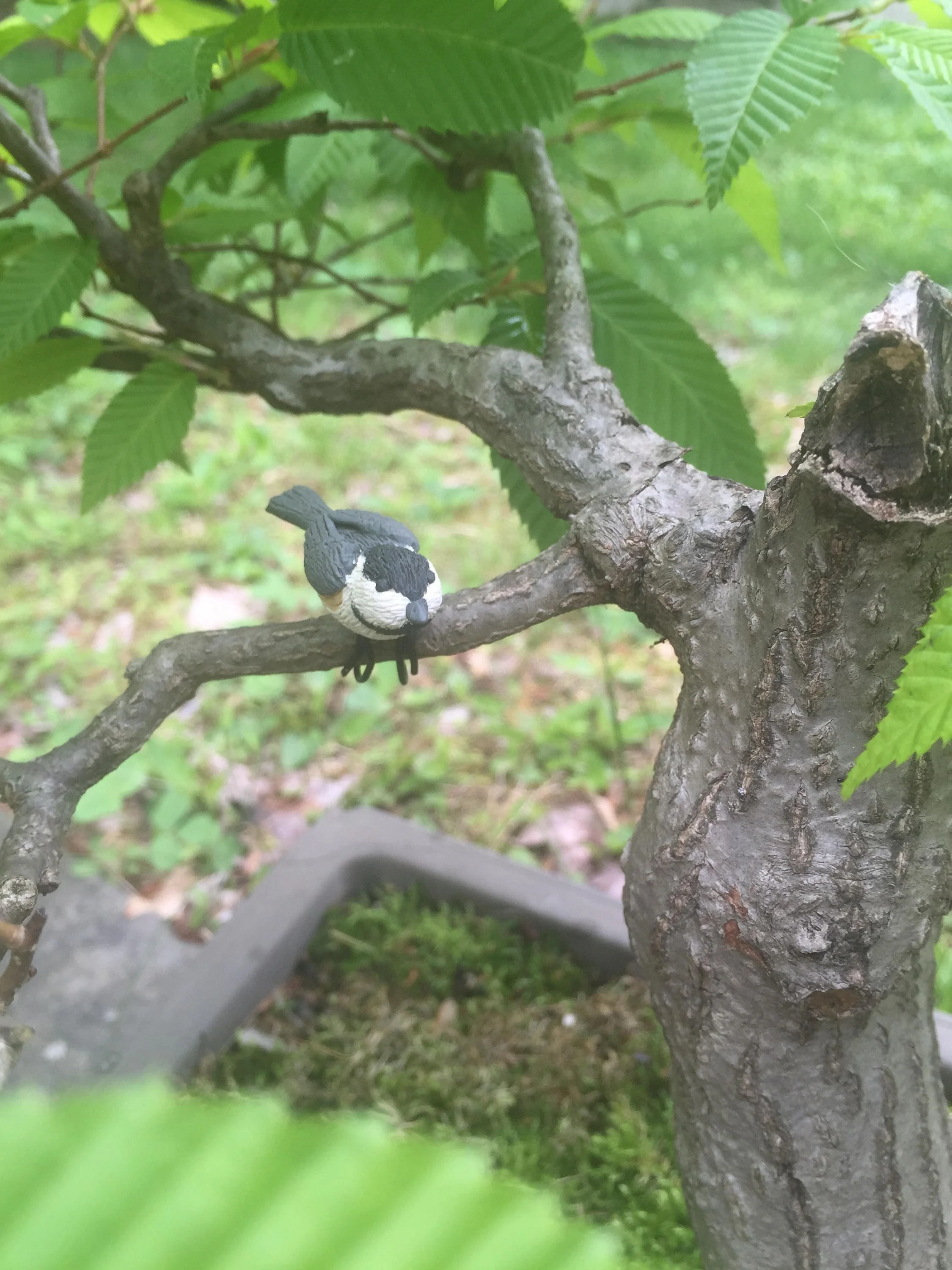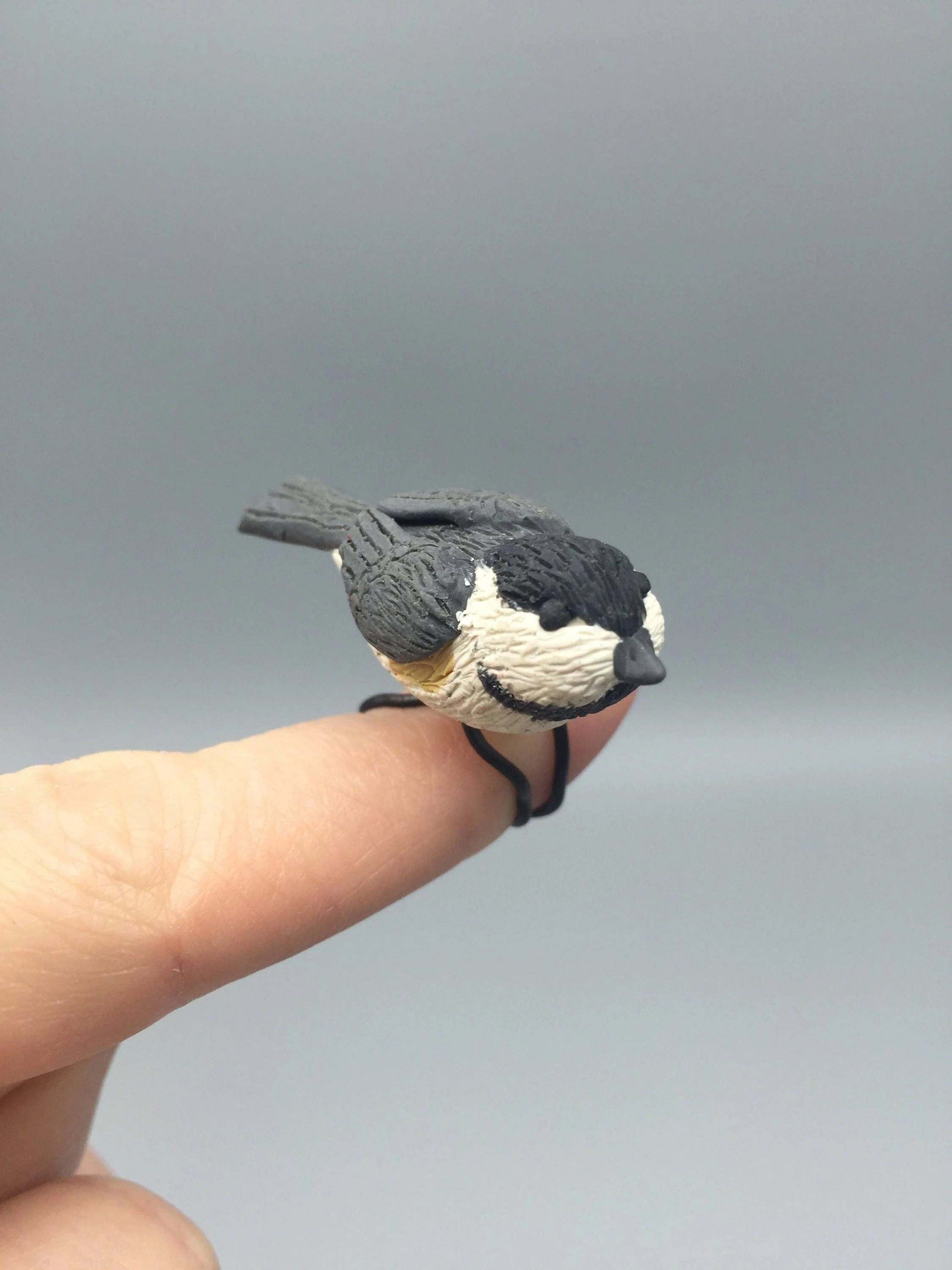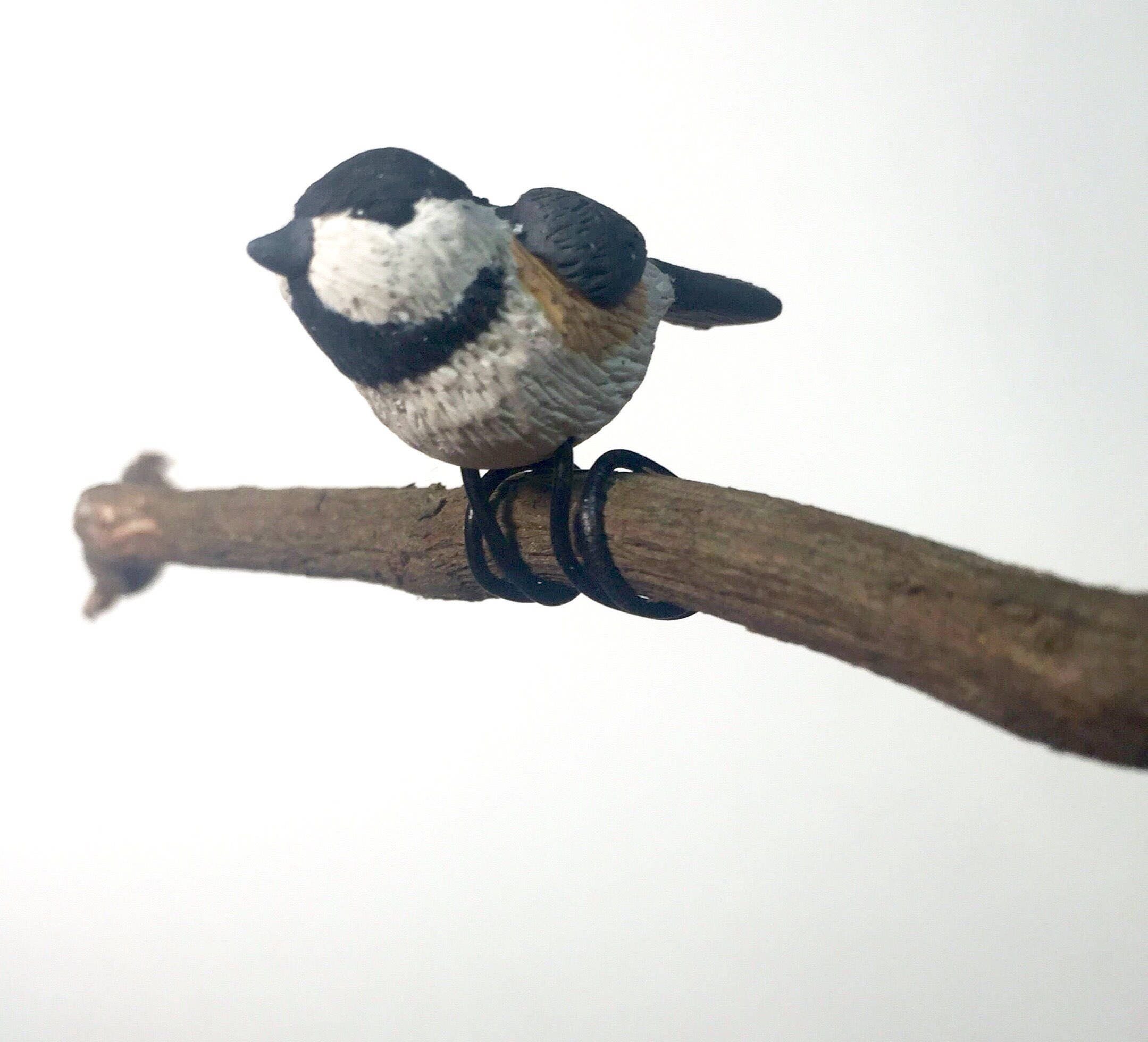 Small chickadee bird sculpture for bonsai tree or fairy garden. Bonsai wire is used to make bendable legs to wrap around a tree branch or they can be straightened and pushed into the soil to hold the bird up.