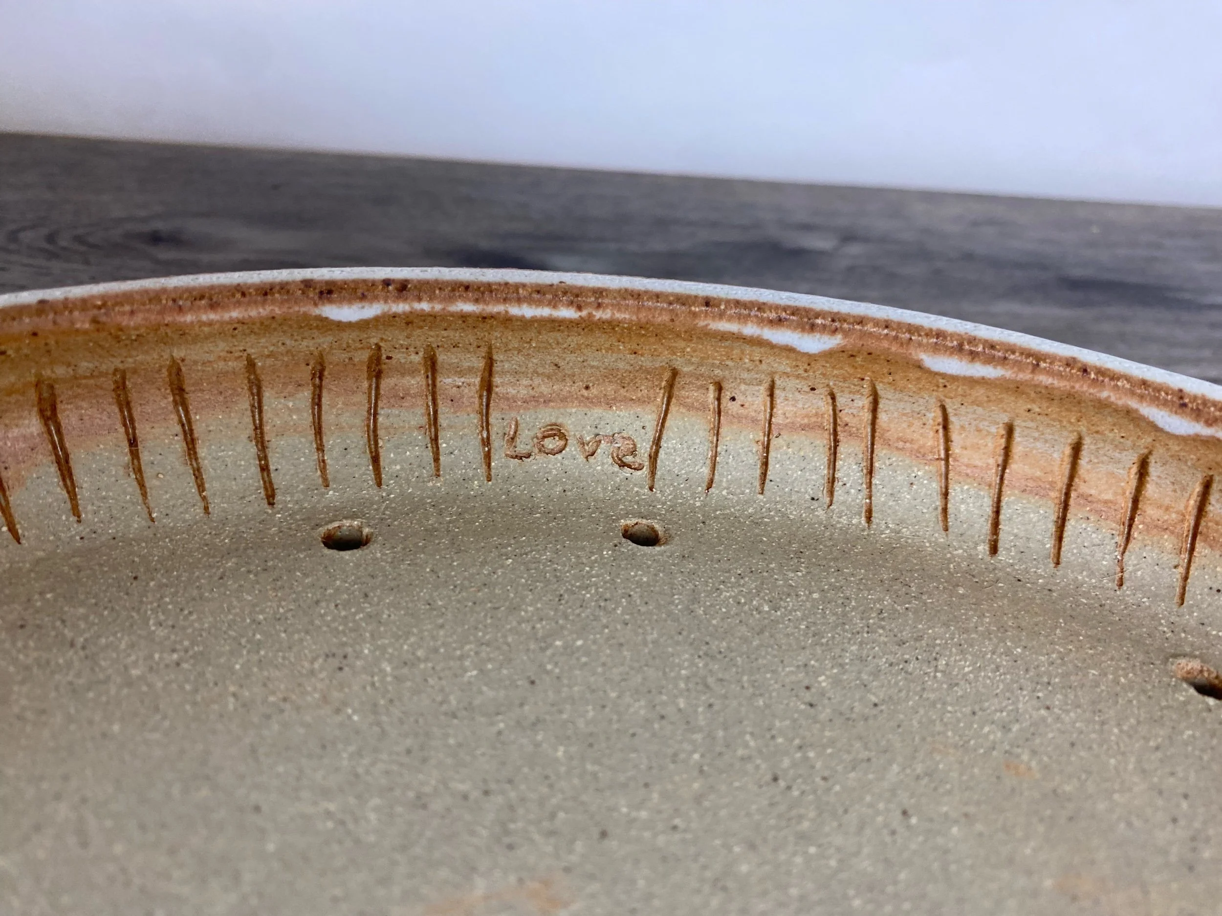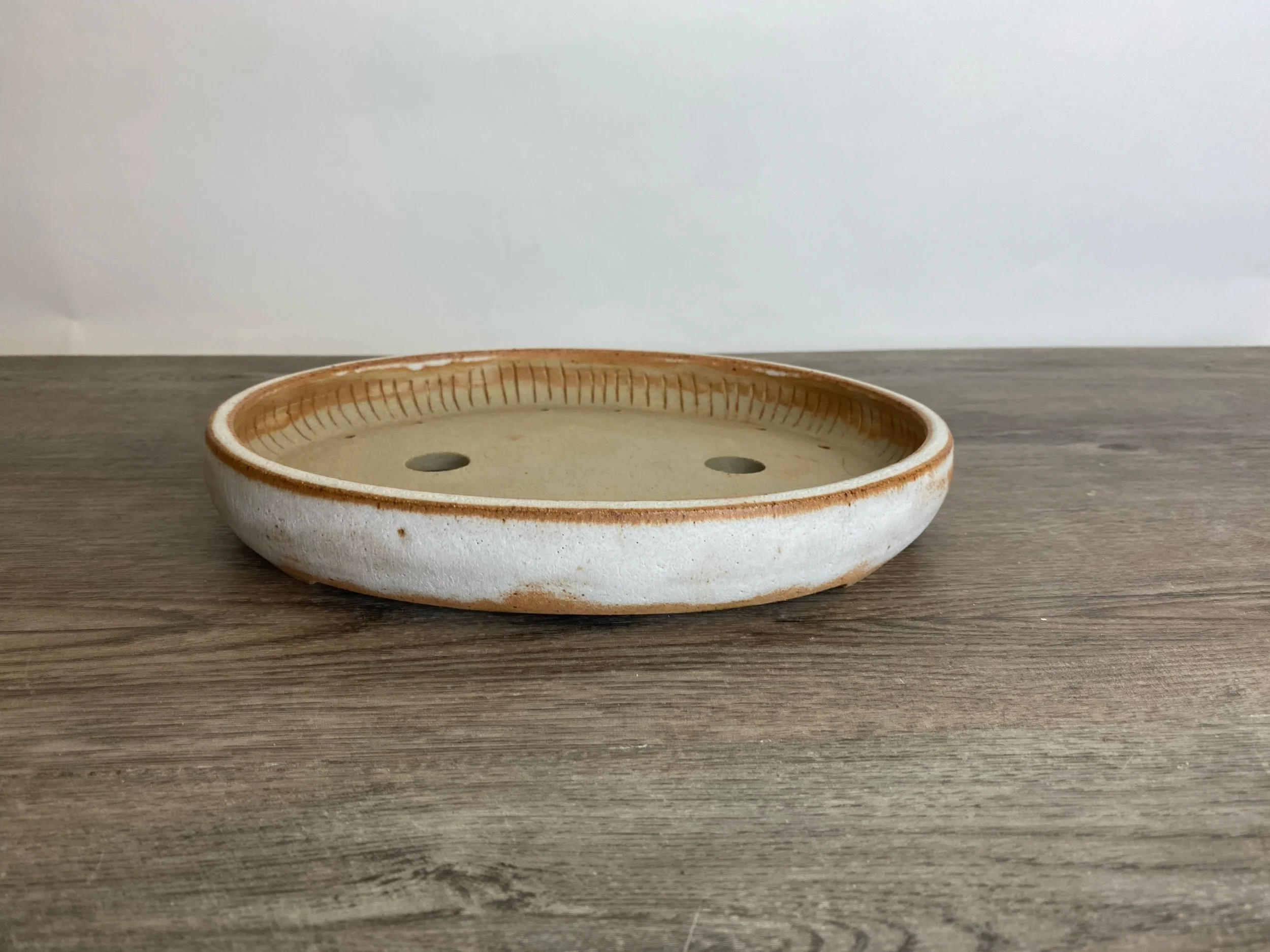 Plain white pot with integrated feet. Lines are carved on the inside walls to help prevent roots from circling the inside of the pot. A message inside is written to the tree that says, "Love".