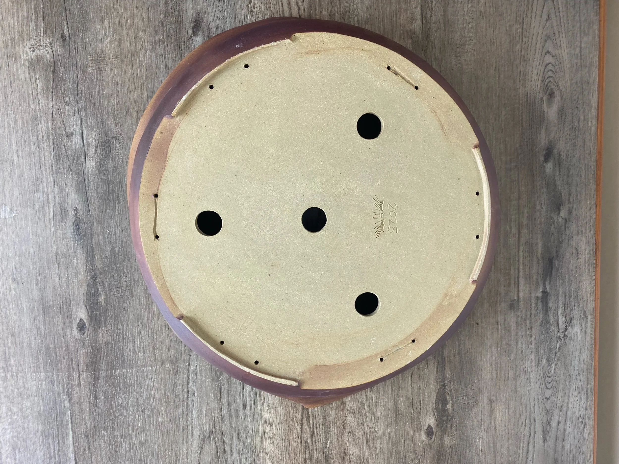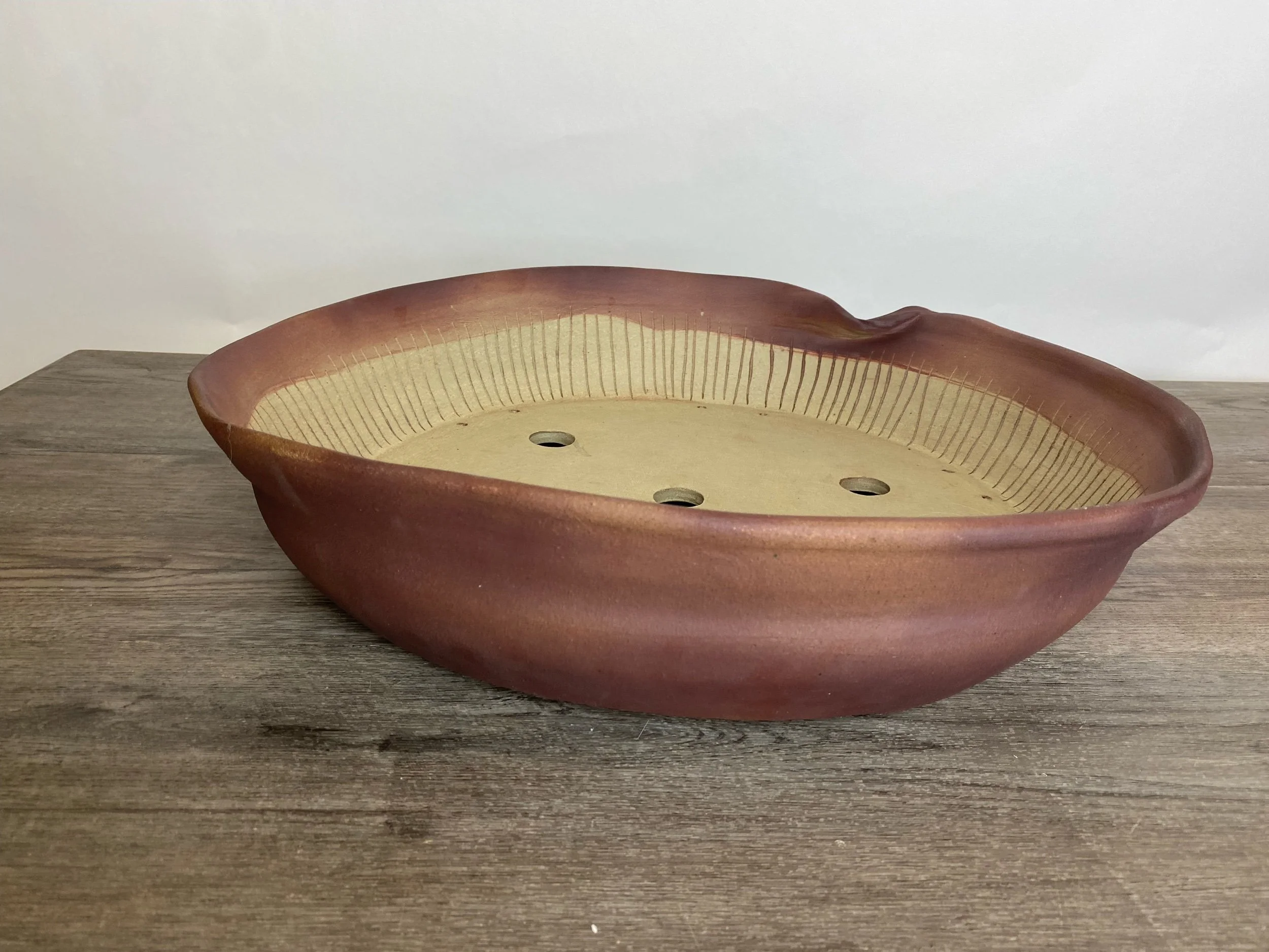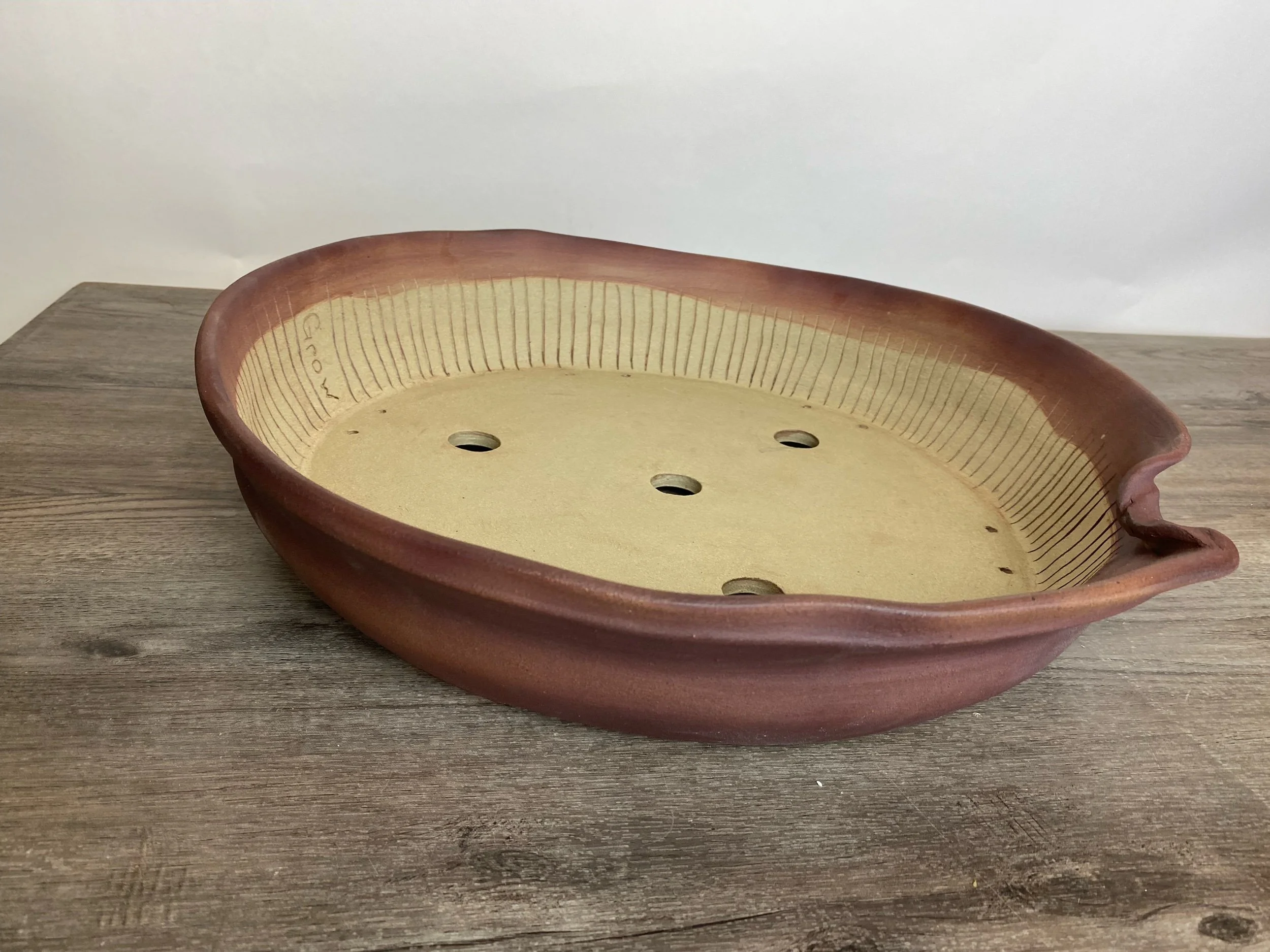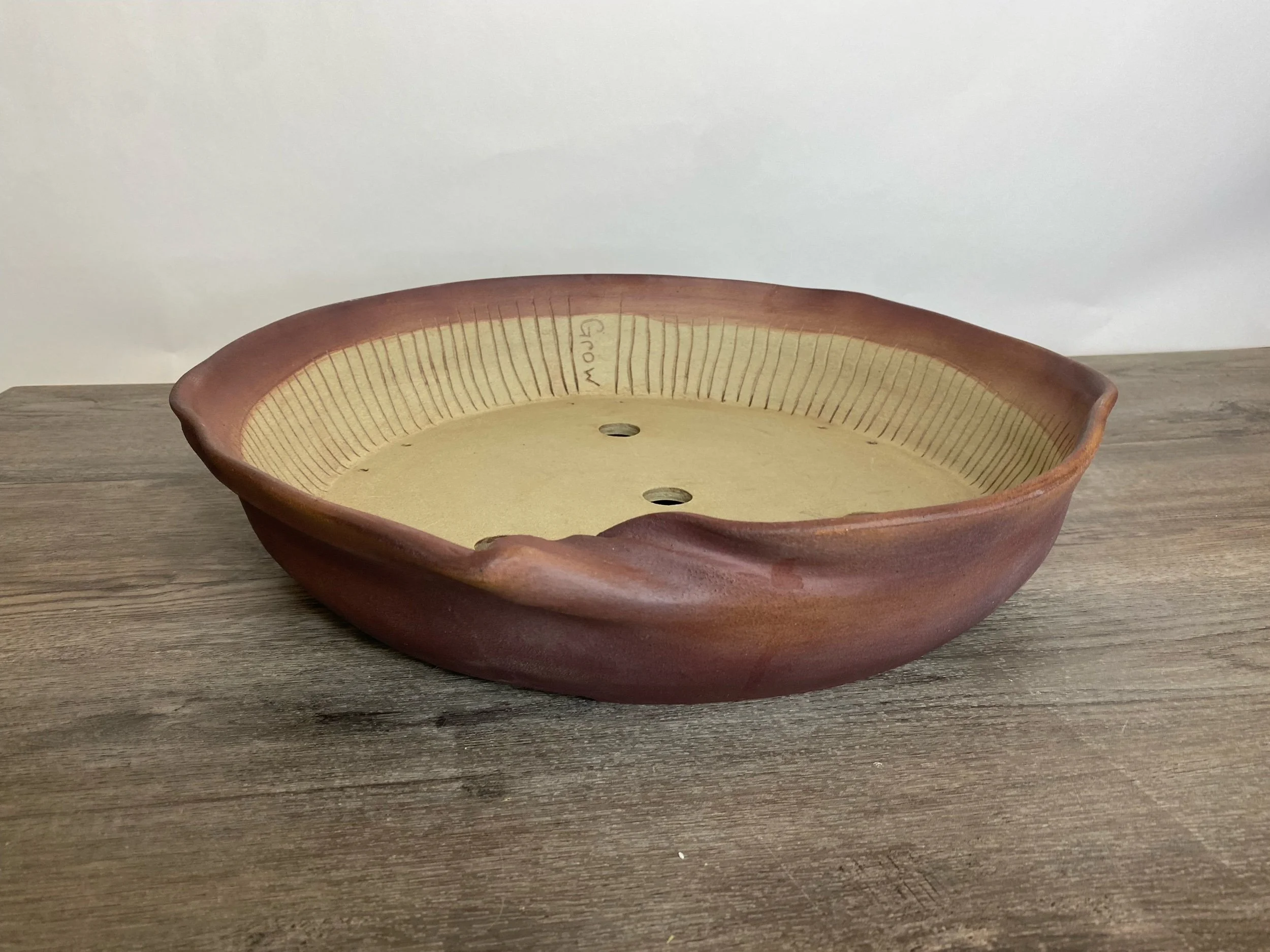 Large wavy reddish brown pot. Lines are carved on the inside walls to help prevent roots from circling the inside of the pot. A message inside is written to the tree that says, “Grow".