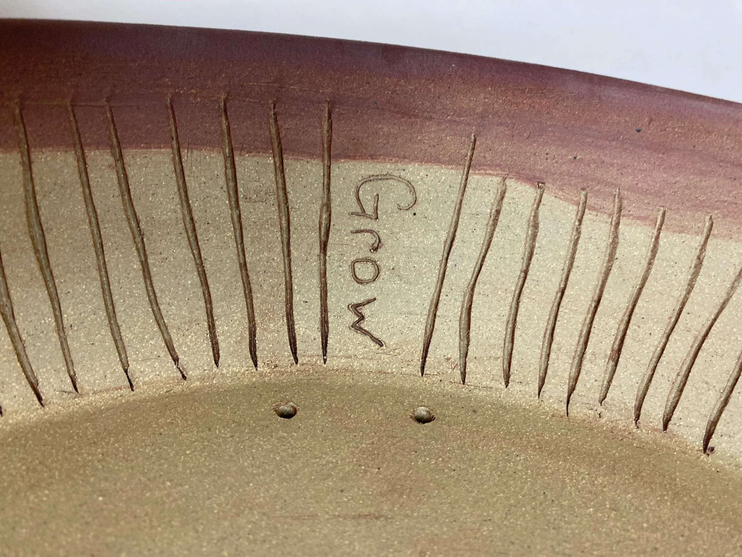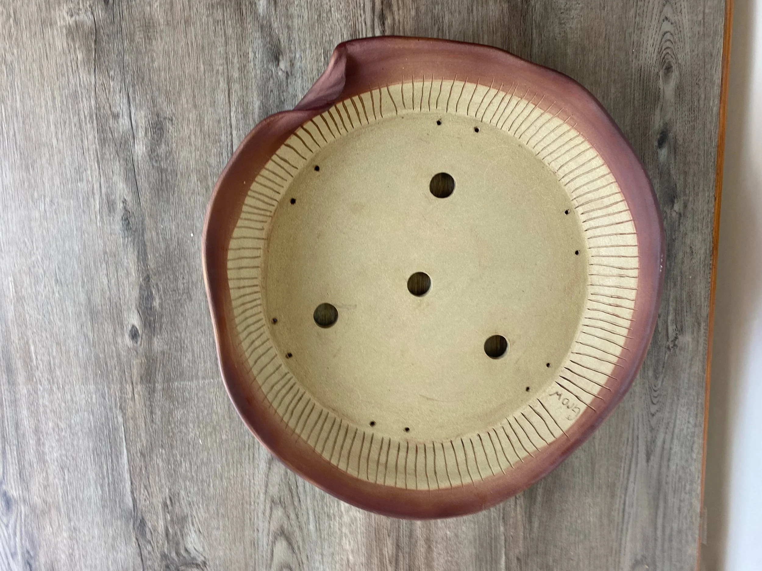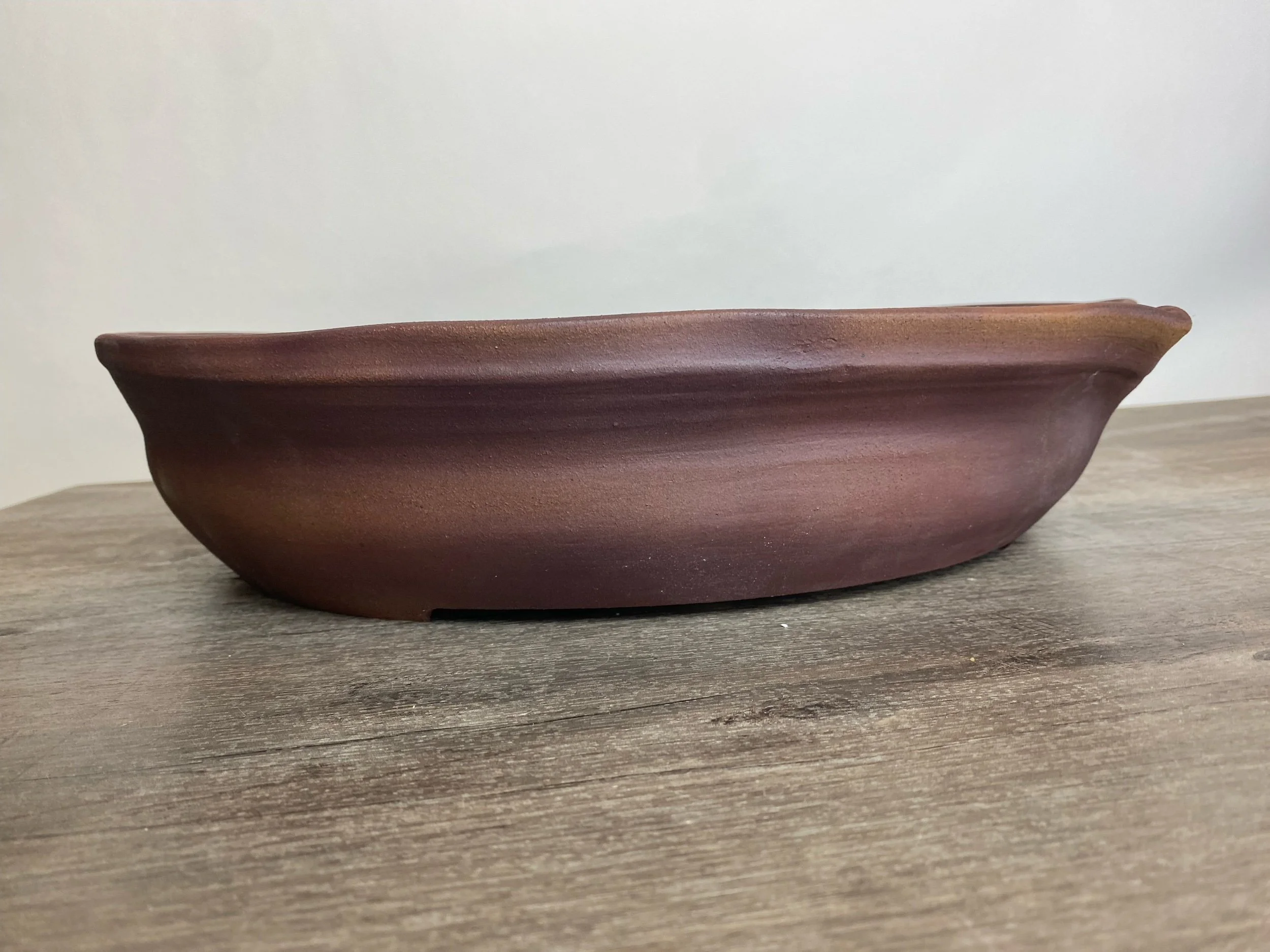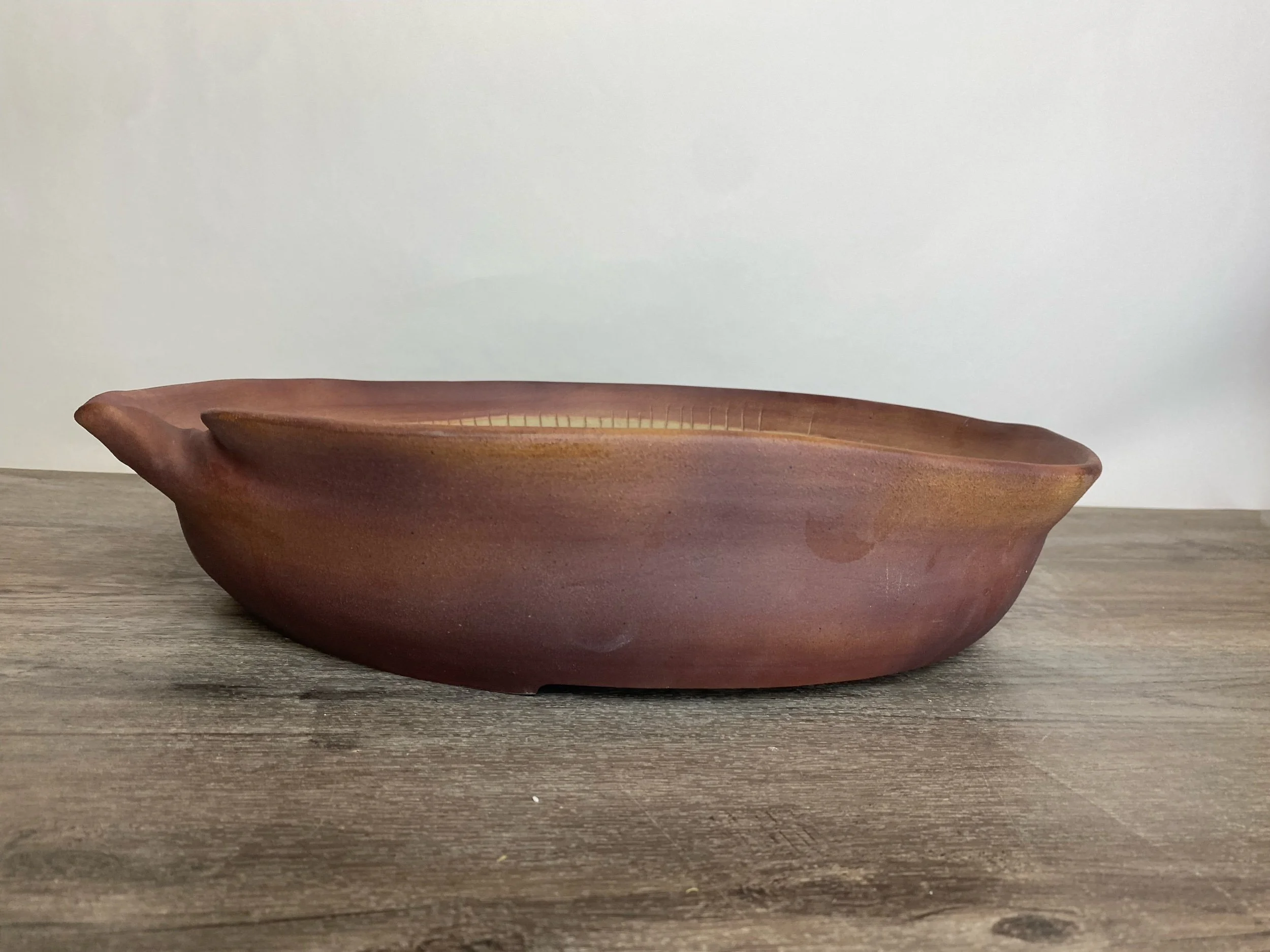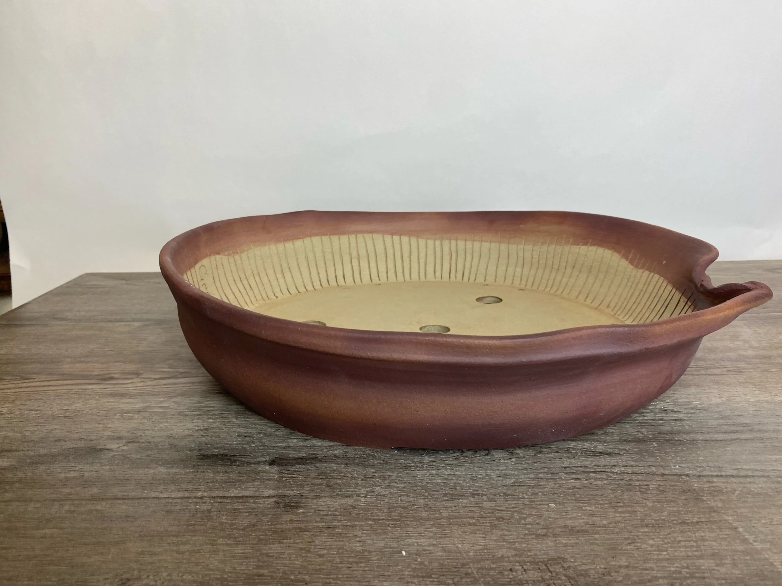 Large wavy reddish brown pot. Lines are carved on the inside walls to help prevent roots from circling the inside of the pot. A message inside is written to the tree that says, “Grow".